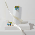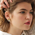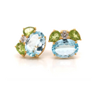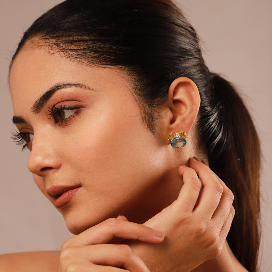 Each earring features a large faceted oval of blue topaz, accented by two delicate peridot leaves and a central round white topaz. Crafted from recycled .925 sterling silver and coated with one micron of recycled 18k gold vermeil, these earrings are a dazzling blend of elegance and sustainability.