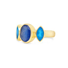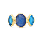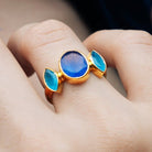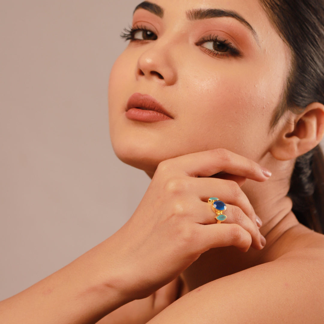 There is a central oval stone of blue quartz and two marquise shaped side stones each in blue chalcedony.  The metal is recycled .925 sterling silver now with two and a half microns of 18k gold vermeil and a water resistant e-coating of laquer for extra durability, so the gold will last a long time.