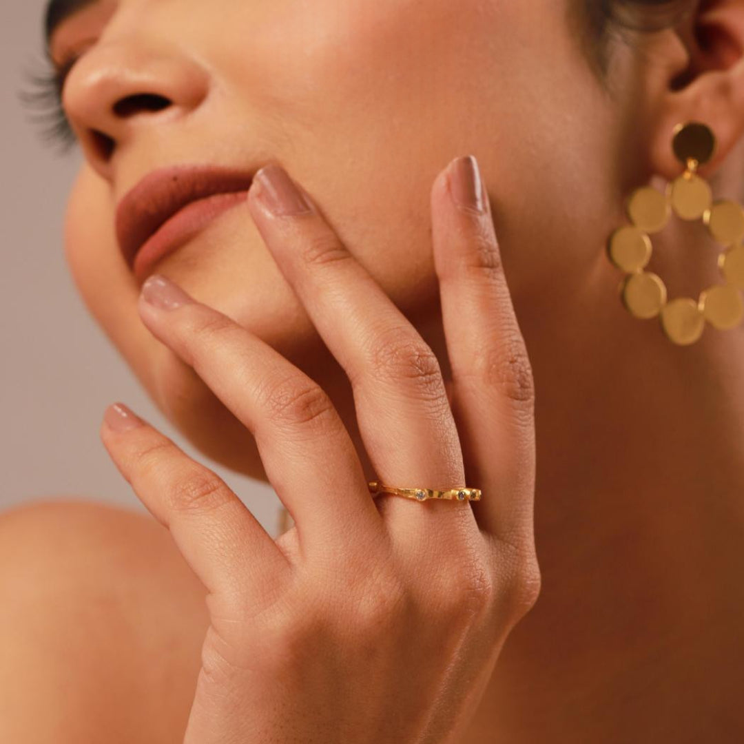 They are a delightful blend of elegance and individuality. Their wavy gold bands and asymmetrically placed gemstones give them a handcrafted, artisanal charm. Notably, they complement the 'Hoop Hoop Hooray' earrings, creating a cohesive and stylish look.