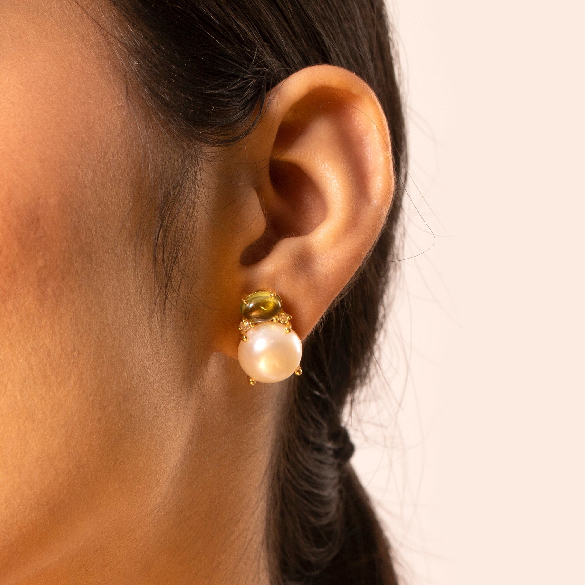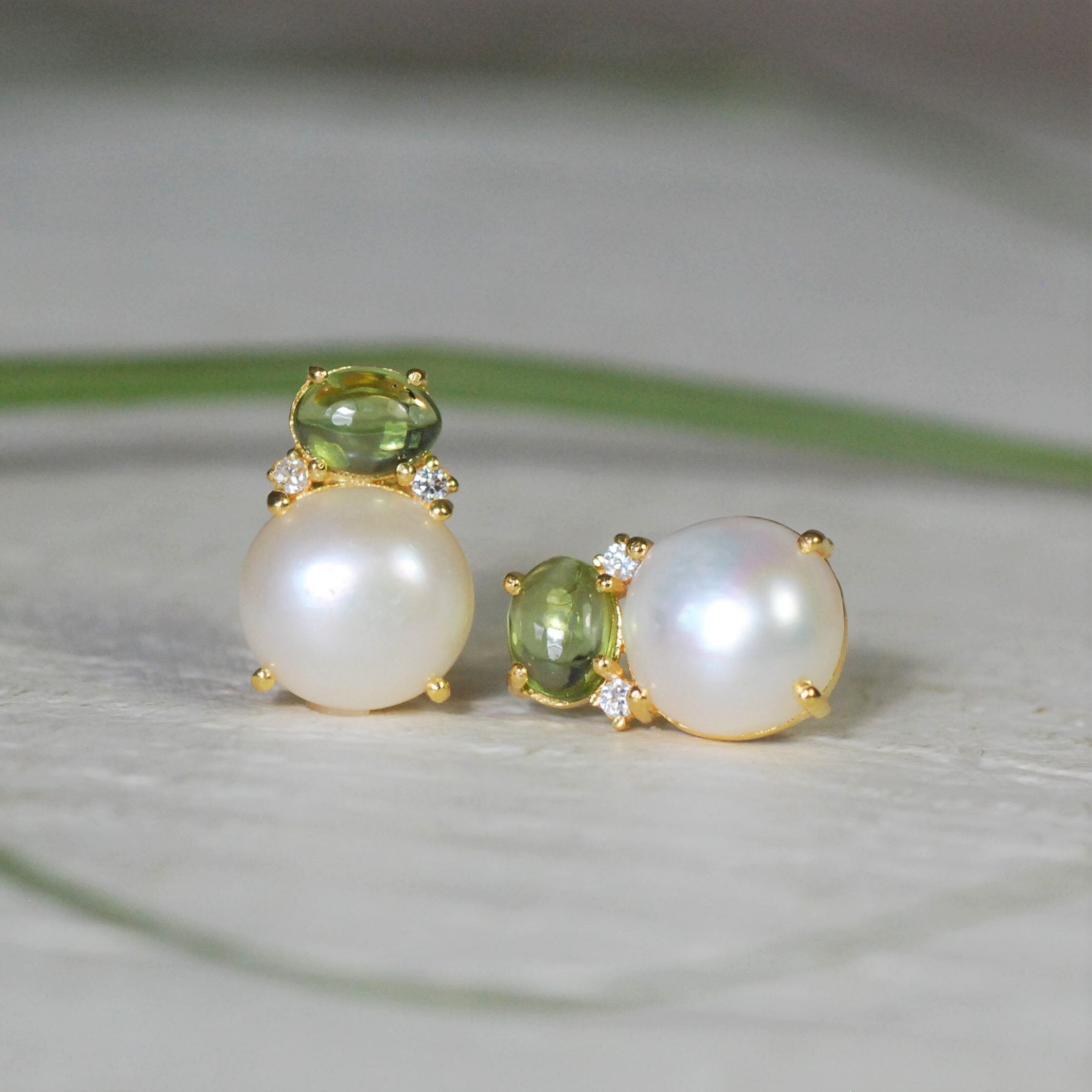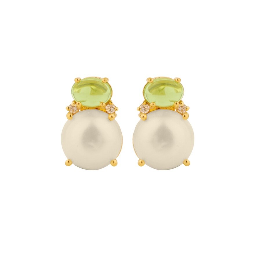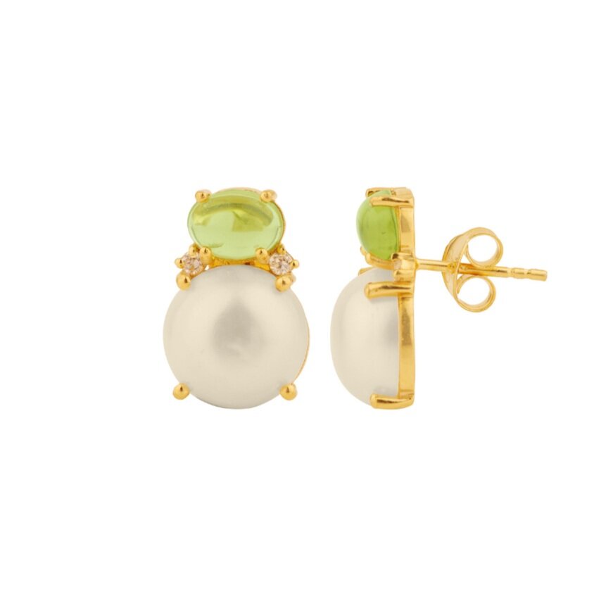 A cabochon oval of bright green peridot, sits above a creamy, round pearl with two cz’s on each side, to add a little sparkle. The gemstones are held in place by four claws and the post comes out from between the two stones, so they sit well up on the ear.