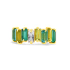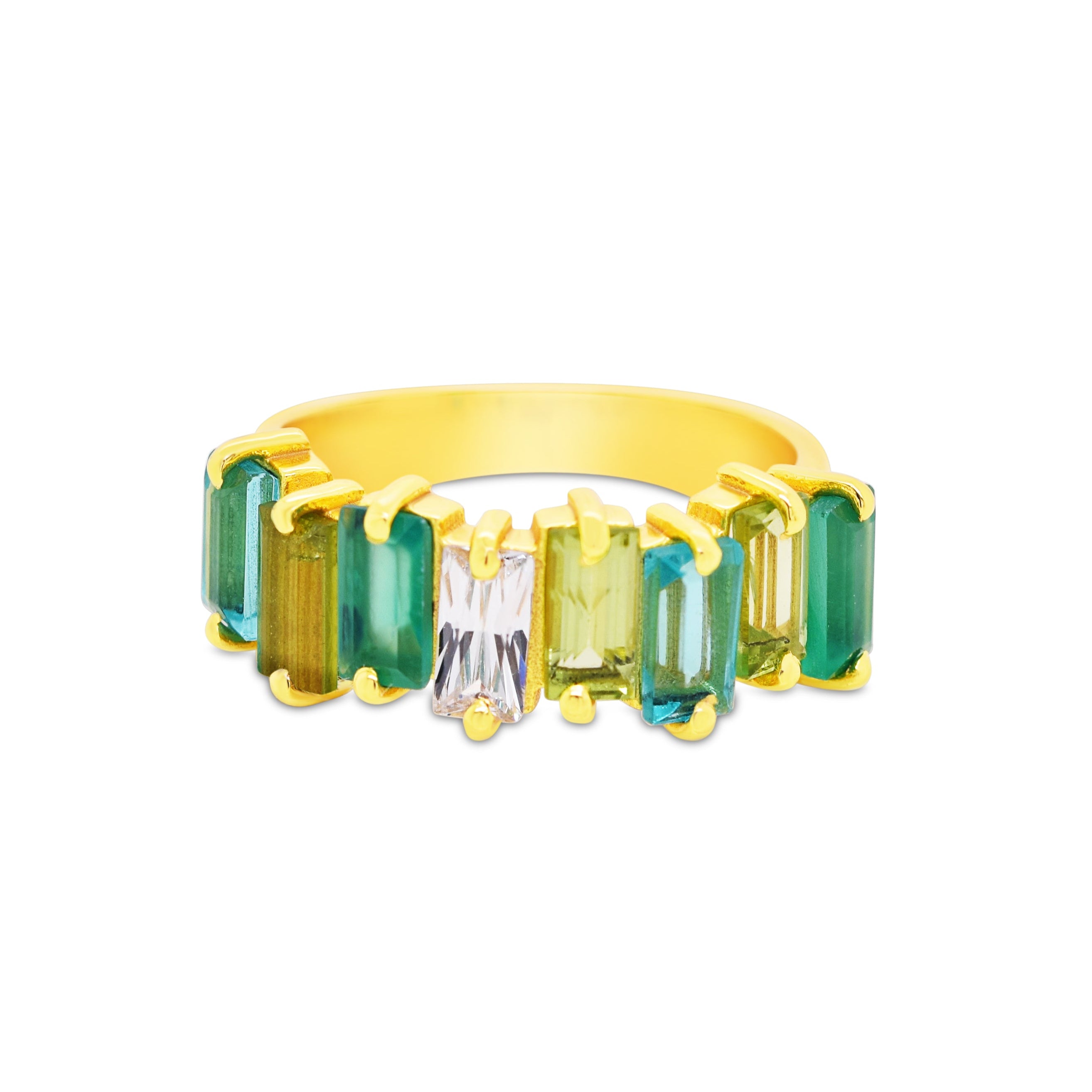 We've created a captivating play of greens for you - two deep green onyx stones, two fresh spring peridots, two vibrant neon apatite, plus a rich vasanite and a sparkling cubic zirconia to catch the light beautifully.