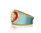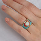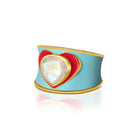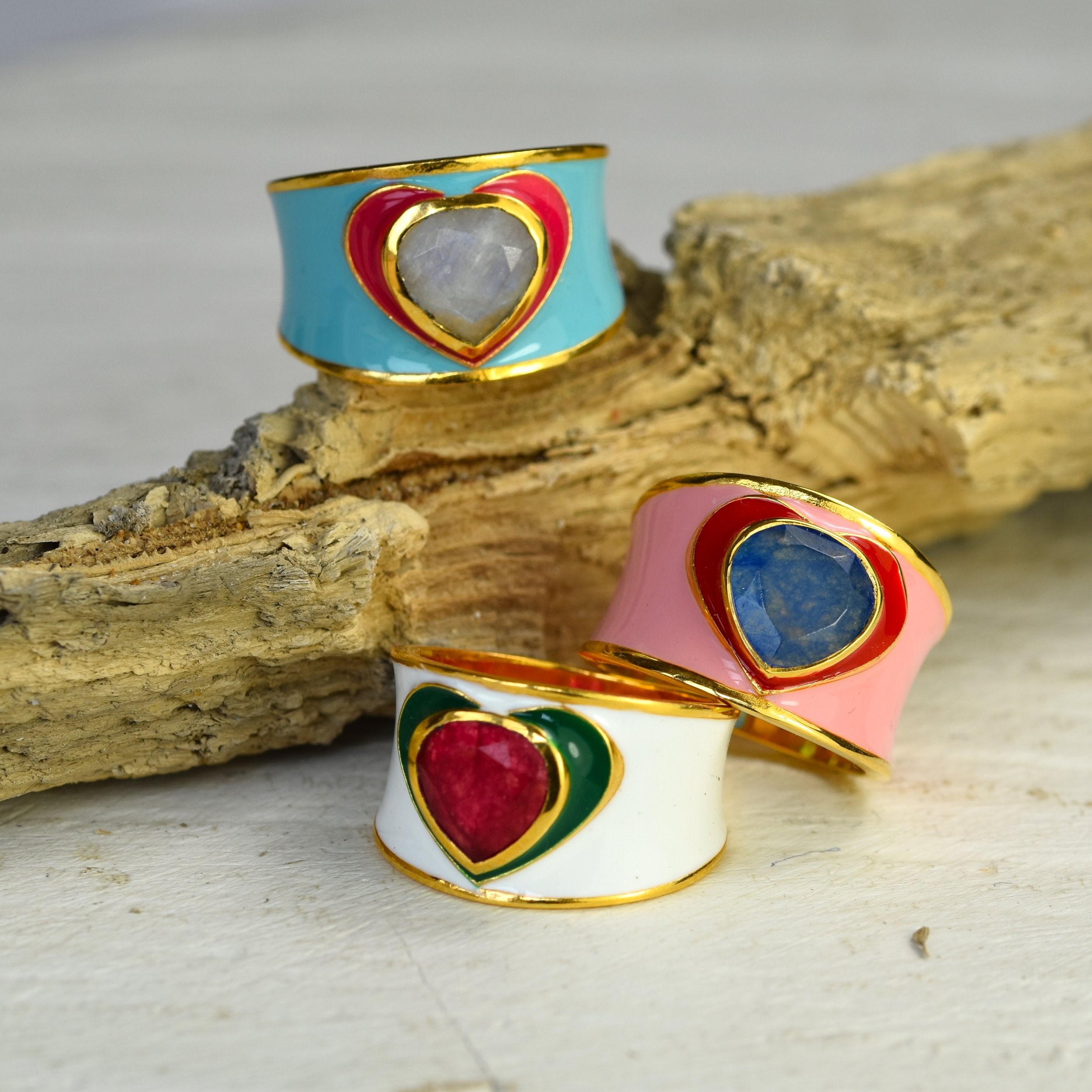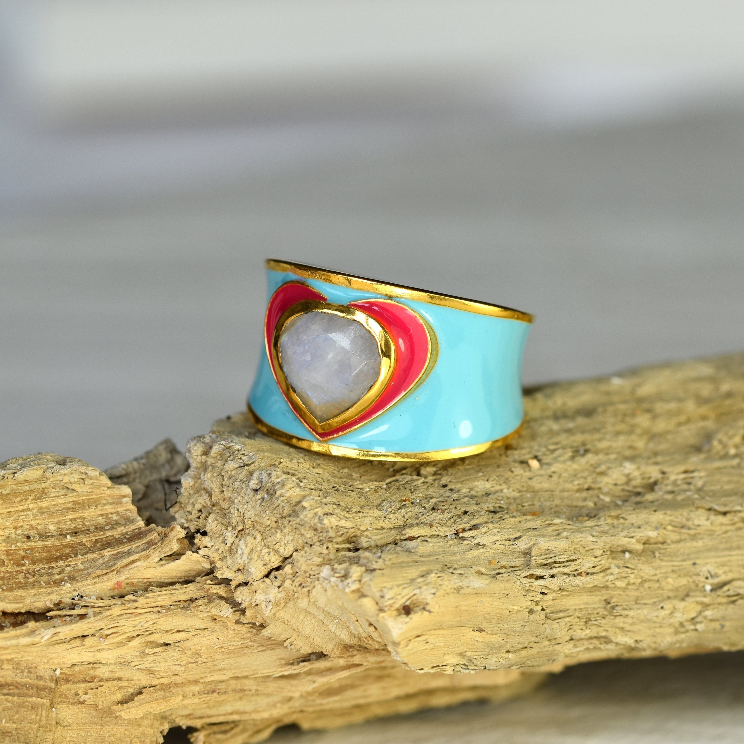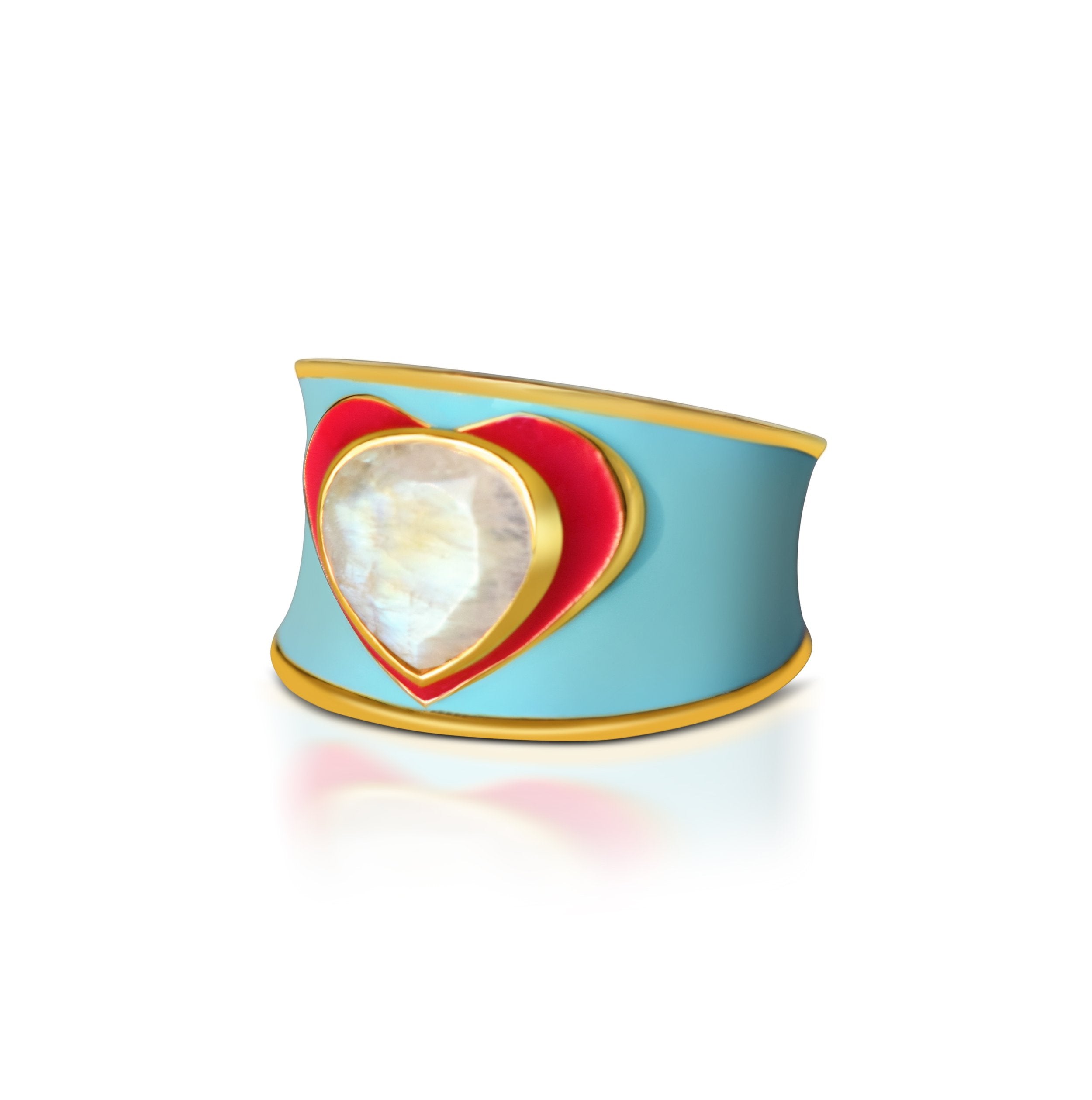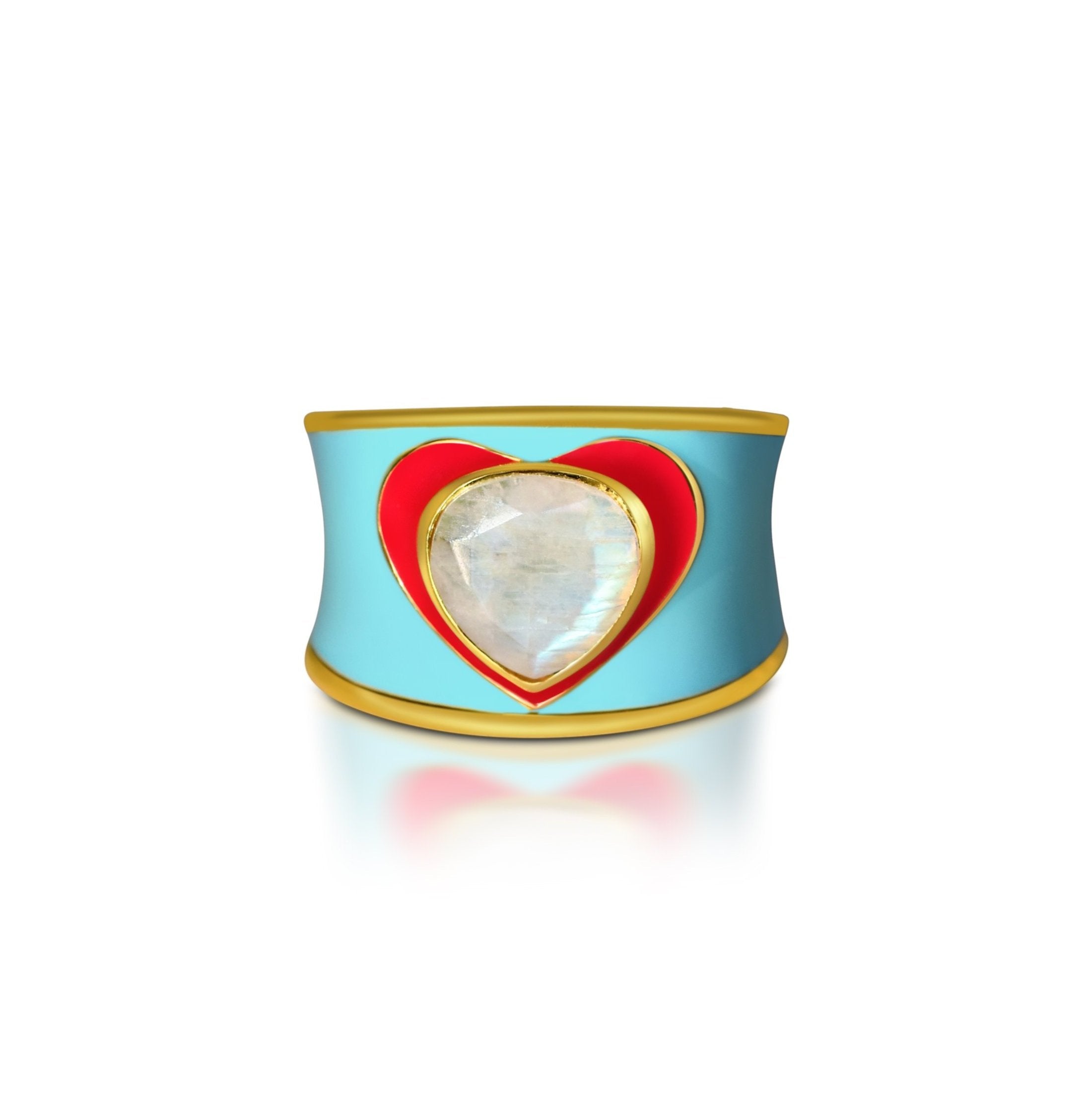 The ring features a wide band of blue enamel adorned with a double heart of moonstone set within a red enamel heart border. Crafted from recycled brass with 2.5 microns of recycled 18k gold vermeil, these rings are designed to withstand the test of time.