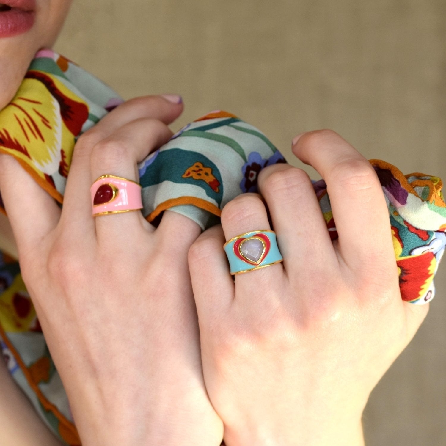 This ring is a delightful blend of gemstone, enamel, and gold vermeil, reminiscent of love hearts and as tempting as candy.