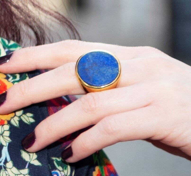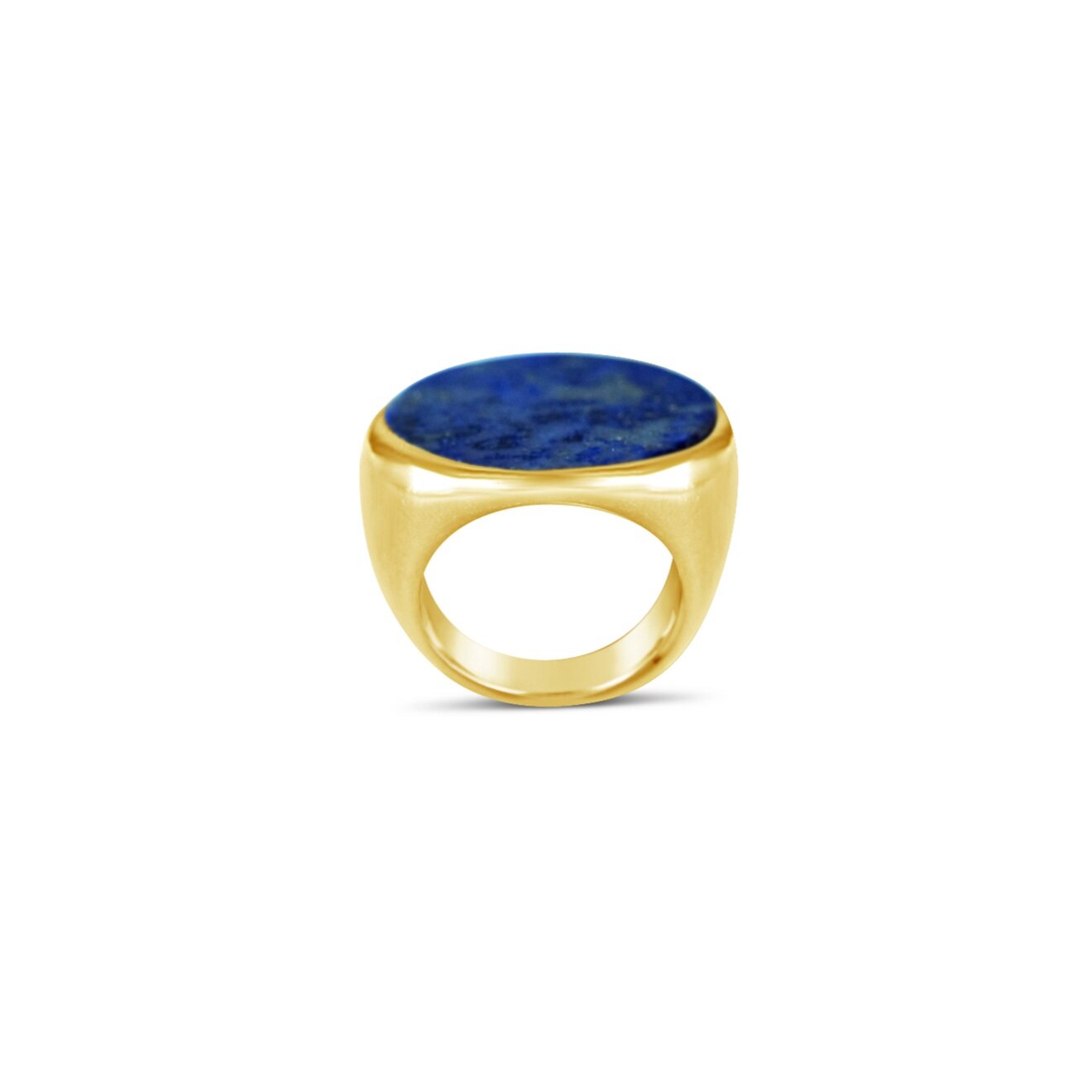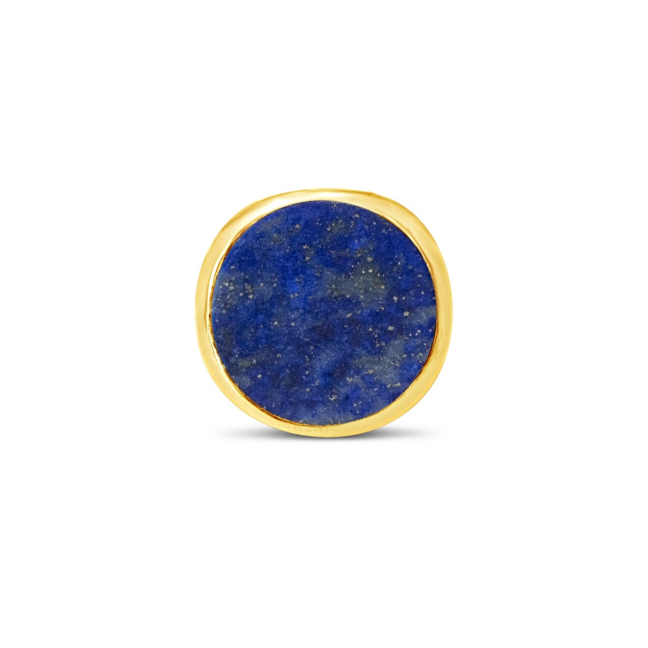 A sleek, ultra-modern flat disc of lapis lazuli is set into a chunky band of shiny 18k gold vermeil. The deep blue stone, flecked with golden pyrite, is enhanced by the golden silhouette of the band ~ bringing a touch of celestial brilliance to your finger.