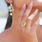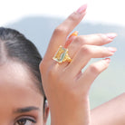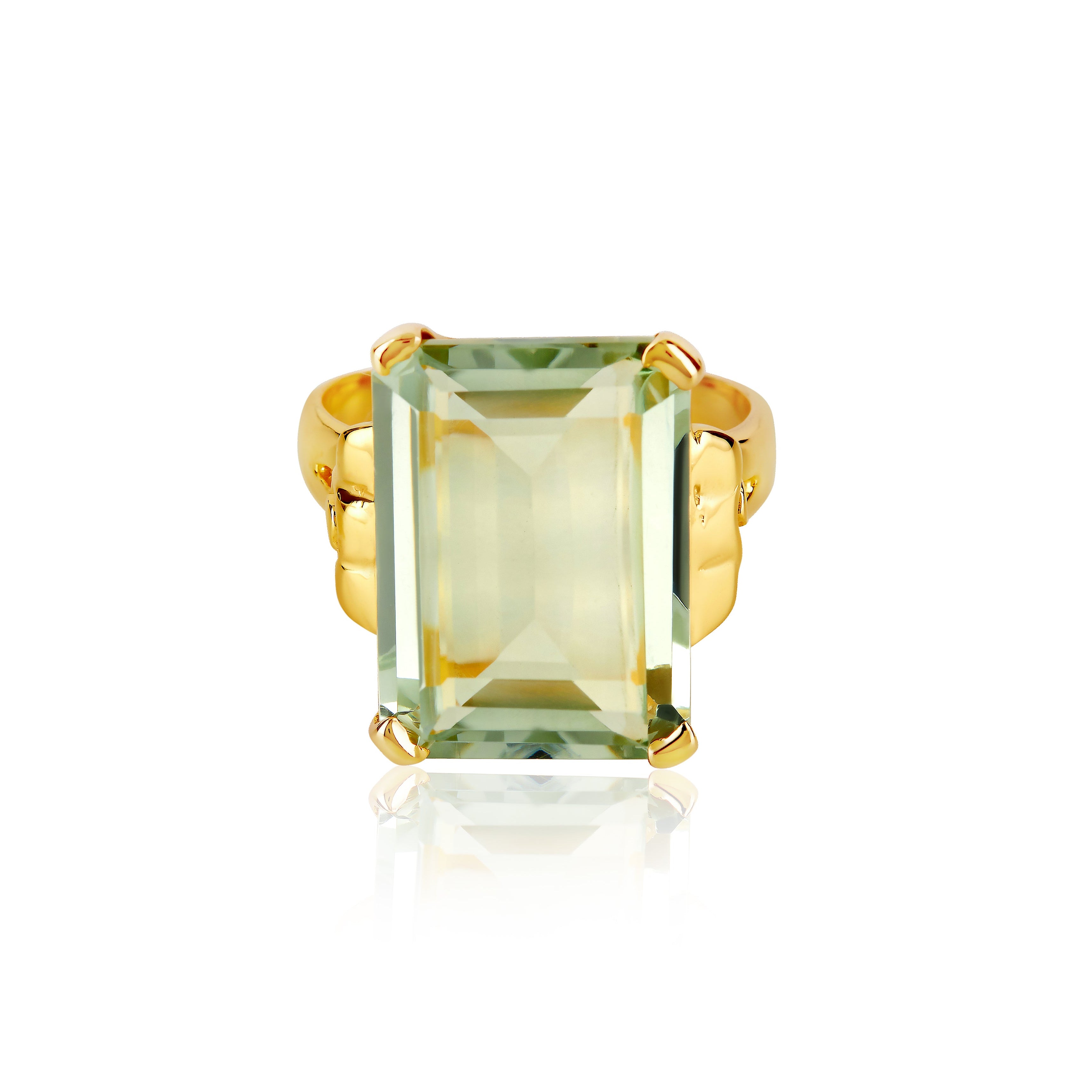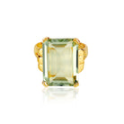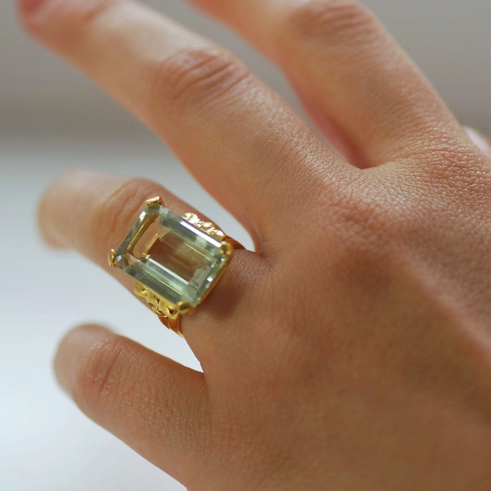 The stone is large and highly faceted and held in place by a claw on each corner. The decorative 18k gilded silver setting adds a richness to the stone.
