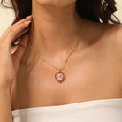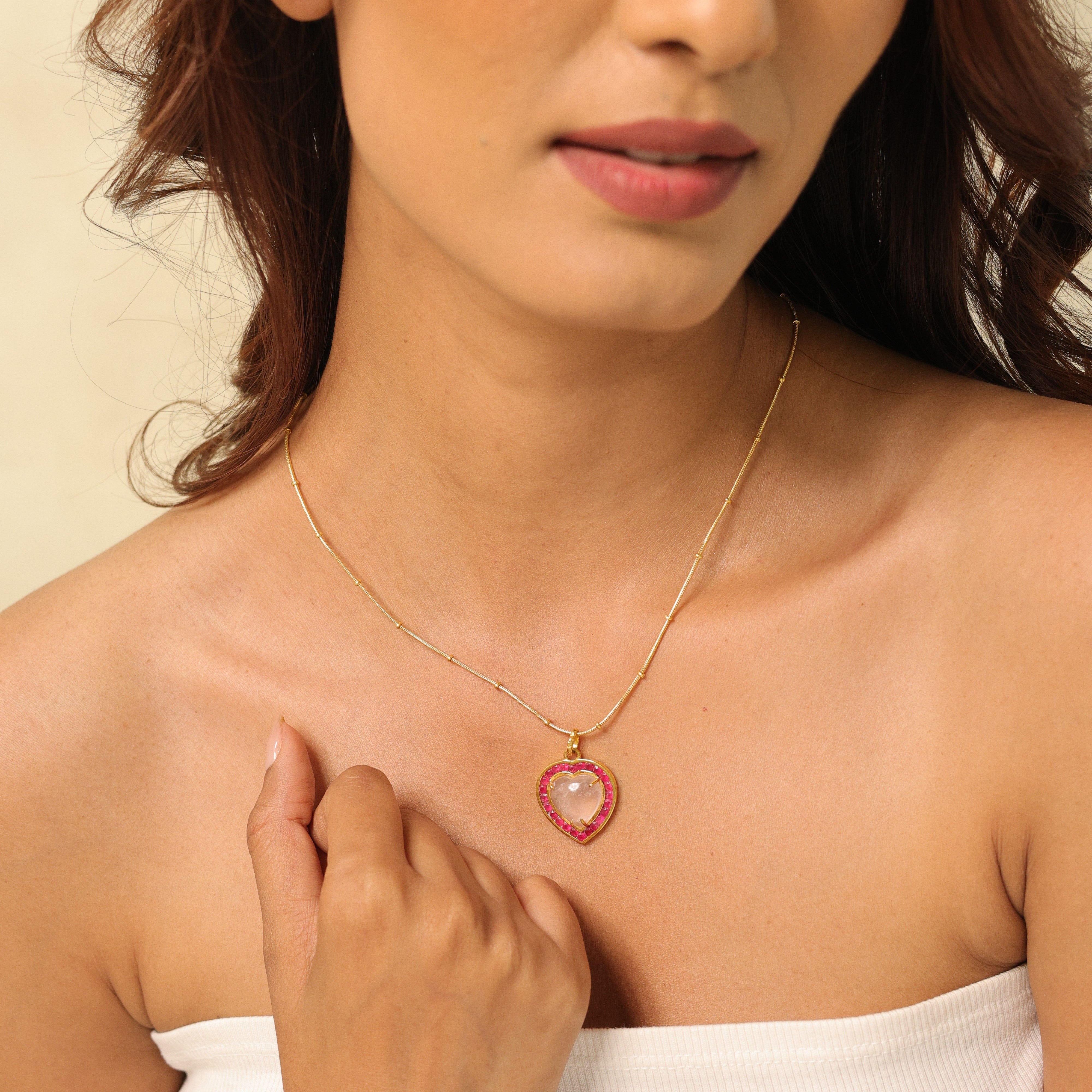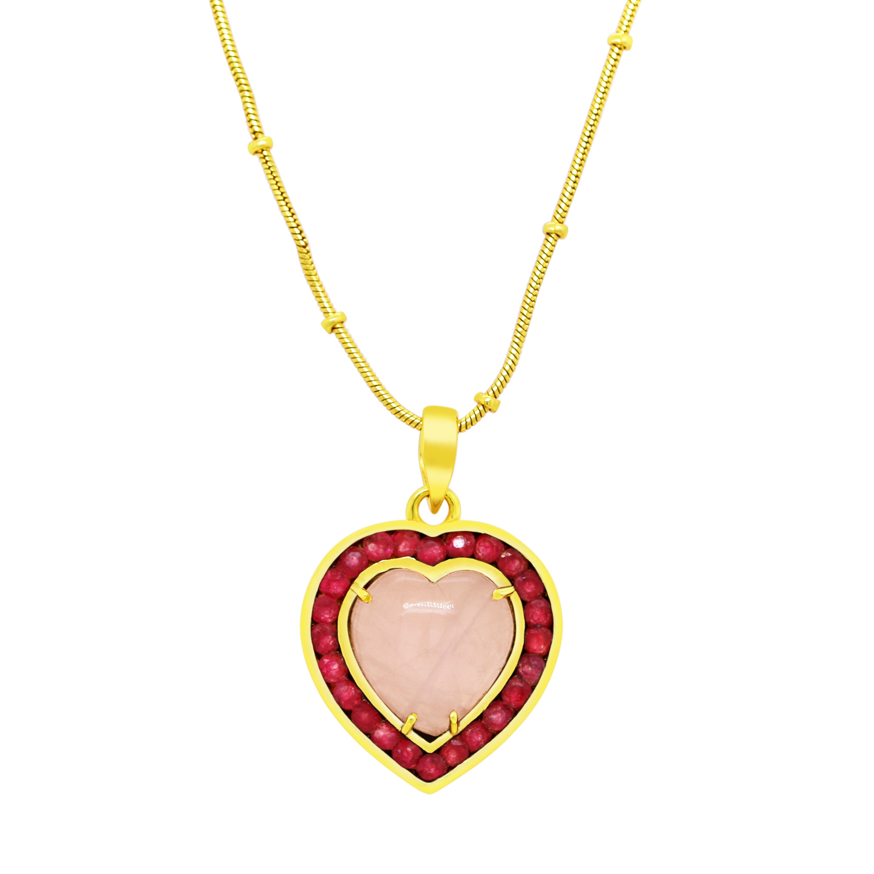 It showcases a stunning heart-shaped rose quartz gemstone, the stone of universal love and compassion, in all its glorious pink softness; framed by a gold surround and encircled with rich fuschia chalcedony in an elegant channel setting.