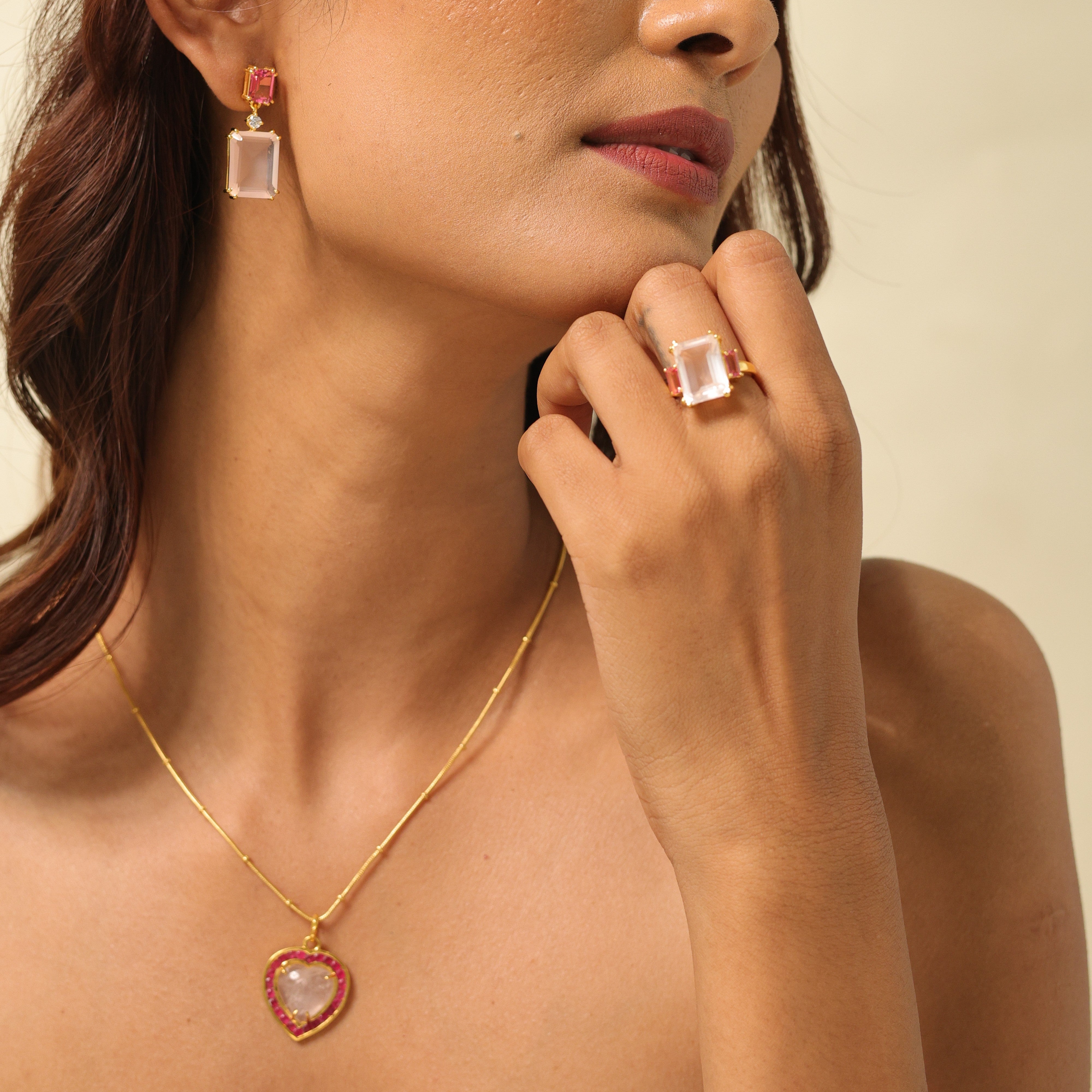 The rose quartz and fuschia combination creates a beautiful harmony of pinks and deep reds that feels both timeless and special.