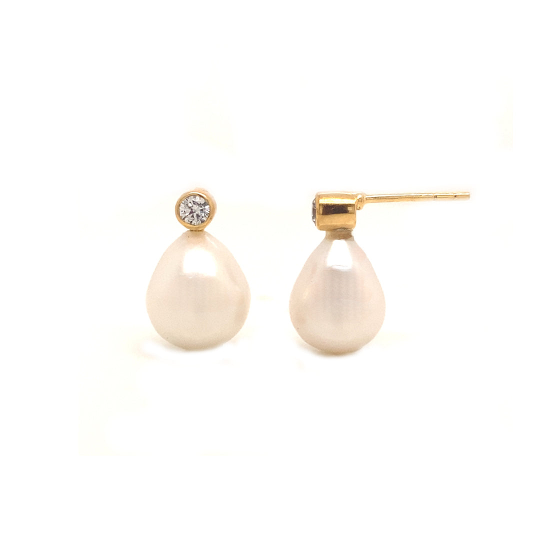 Each earring features a beautiful tear drop-shaped pearl, elegantly suspended below a small cubic zirconia stud, also known as a "poor man's diamond". They are set in one micron of 18k gilded recycled .925 sterling silver, so the gold will last very well.