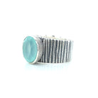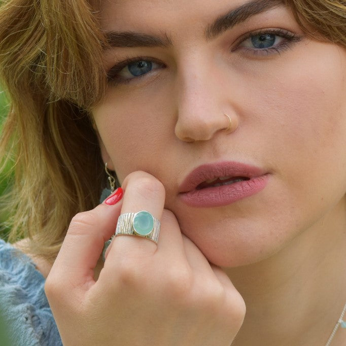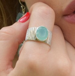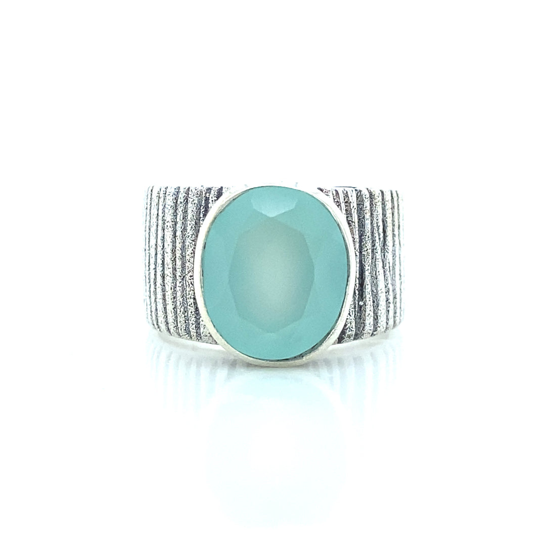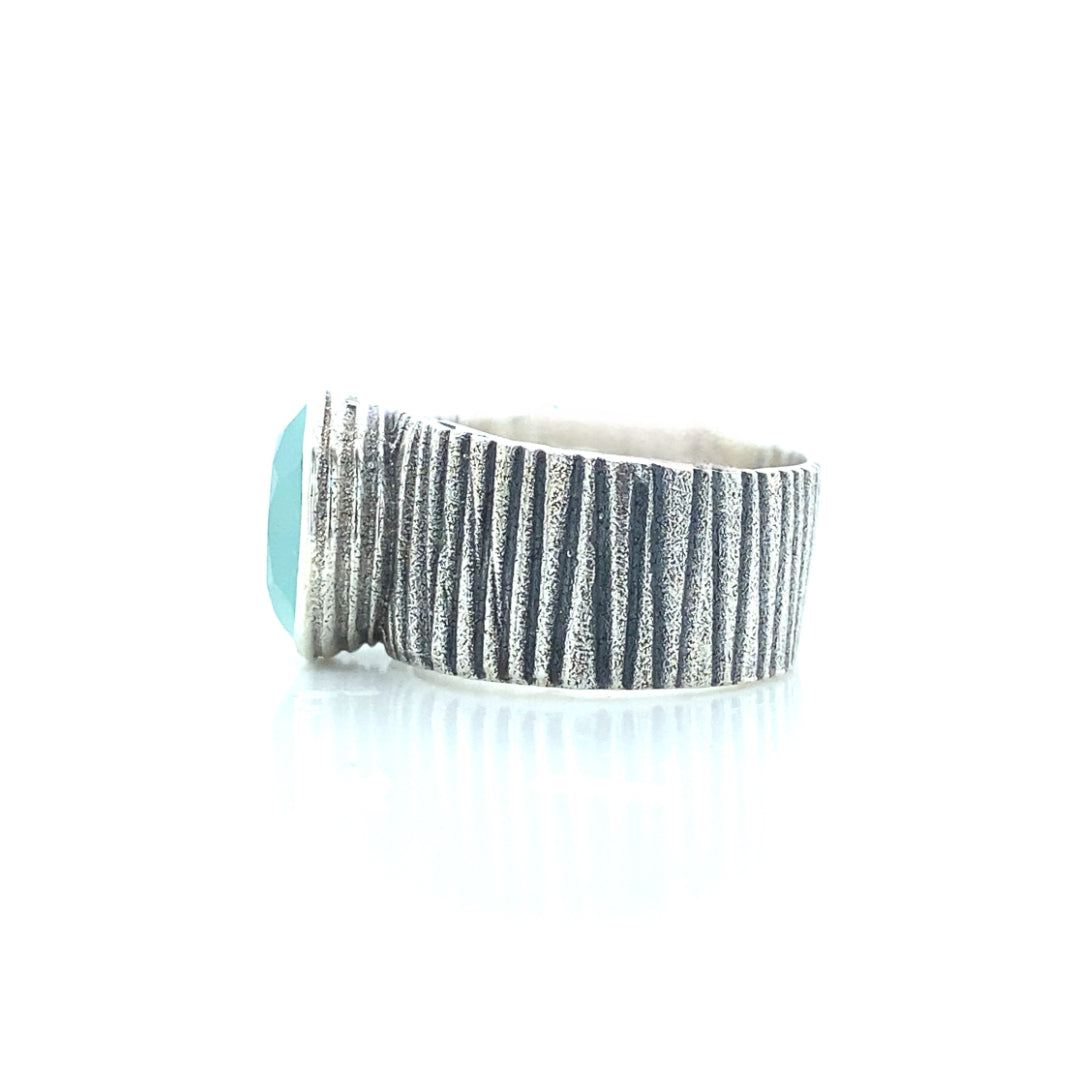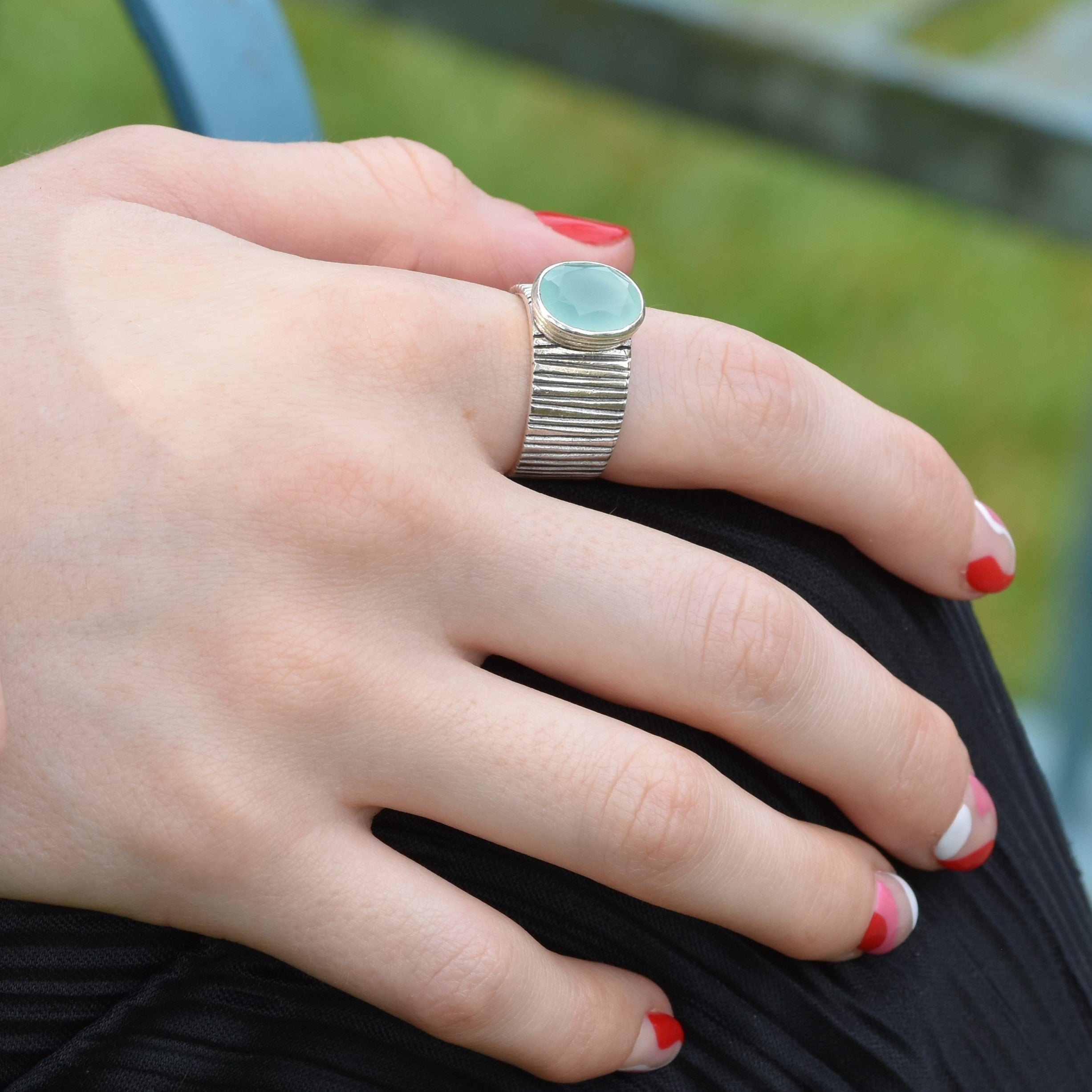 This is a wonderful heavy, organic ring with its striking pattern of horizontal lines etched out of the band, continuing around the wide stone mount. In contrast the aqua chalcedony gemstone is a wonderfully soft and gentle colour.
