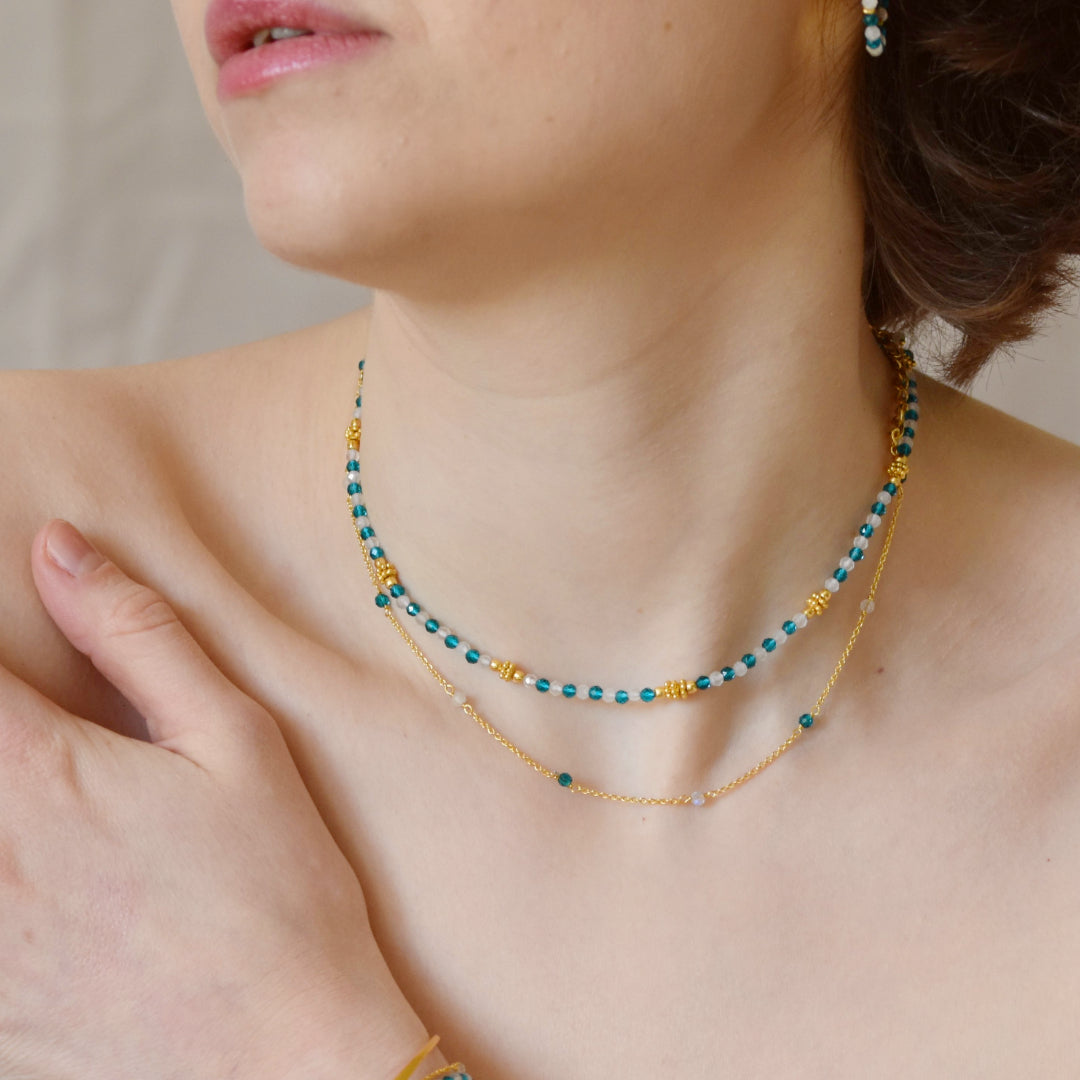 This delightful toggle bead necklace is part of our fabulous mix and match Bead Collection, offering a versatile range of necklaces, earrings, and bracelets. Featuring alternating rainbow moonstone and neon (glass) apatite accented with decorative gold pieces and gold balls, this necklace exudes charm and elegance.