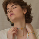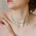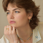 Fastened with a toggle that can be worn at the front or back, the toggle showcases a rainbow moonstone bead at one end and a neon apatite at the other, adding a delightful design detail. Crafted from recycled brass with 2.5 microns of recycled 18k gold vermeil, this necklace not only boasts style but also contributes to environmental sustainability. With its sophistication and colourful artistry, it's destined to become a cherished addition to any jewelry collection.