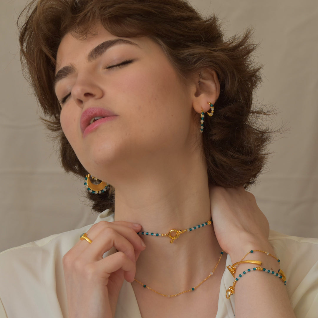 Our pieces are handmade in Jaipur, a city where jewellery is not just worn, but revered. Working closely with a small team of skilled artisans, we honour both heritage techniques and modern forms. Every detail is considered. Every gemstone placed with care. The result: jewellery that holds emotion, energy and elegance.