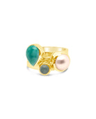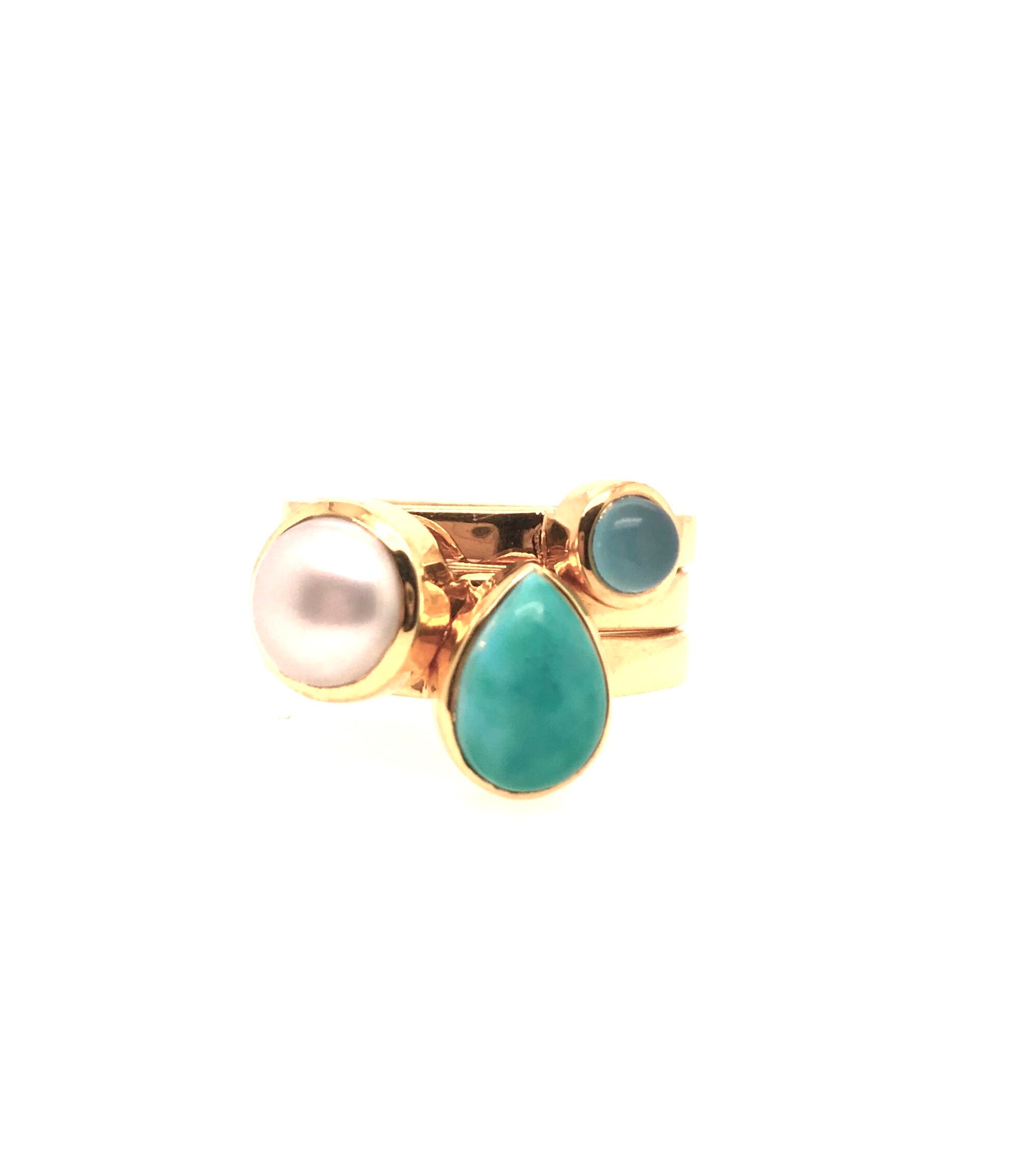 A teardrop of turquoise, is combined with a circular pearl and a small round aqua chalcedony, so the colour combination of the ring is fresh and summery.