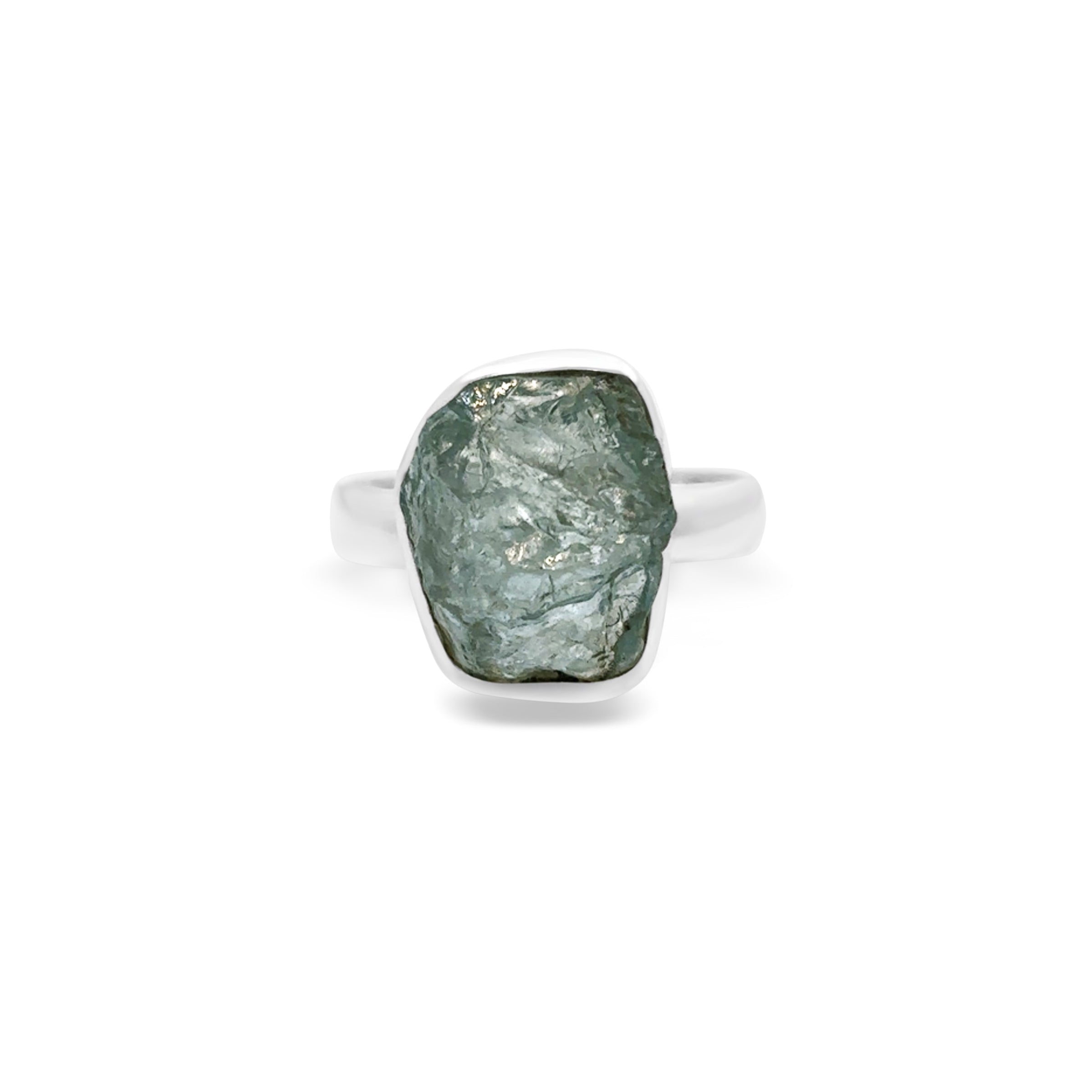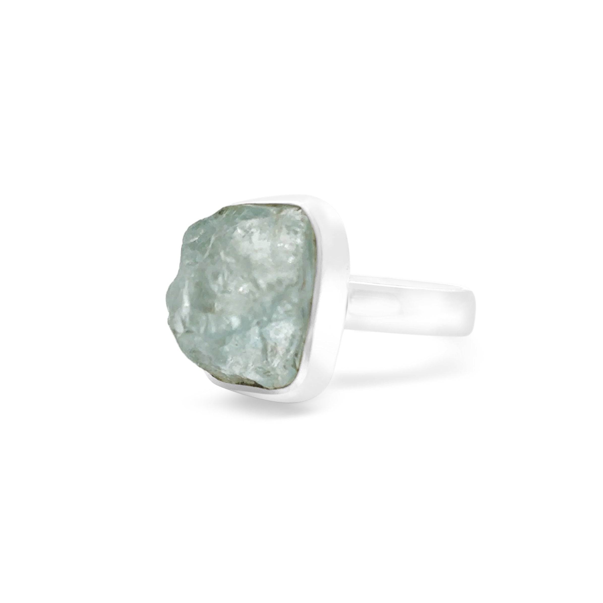 This lovely ring is made by hand and features a large and stunning rough-cut aquamarine set in a simple recycled .925 sterling silver bezel with a narrow band around the finger.