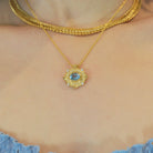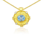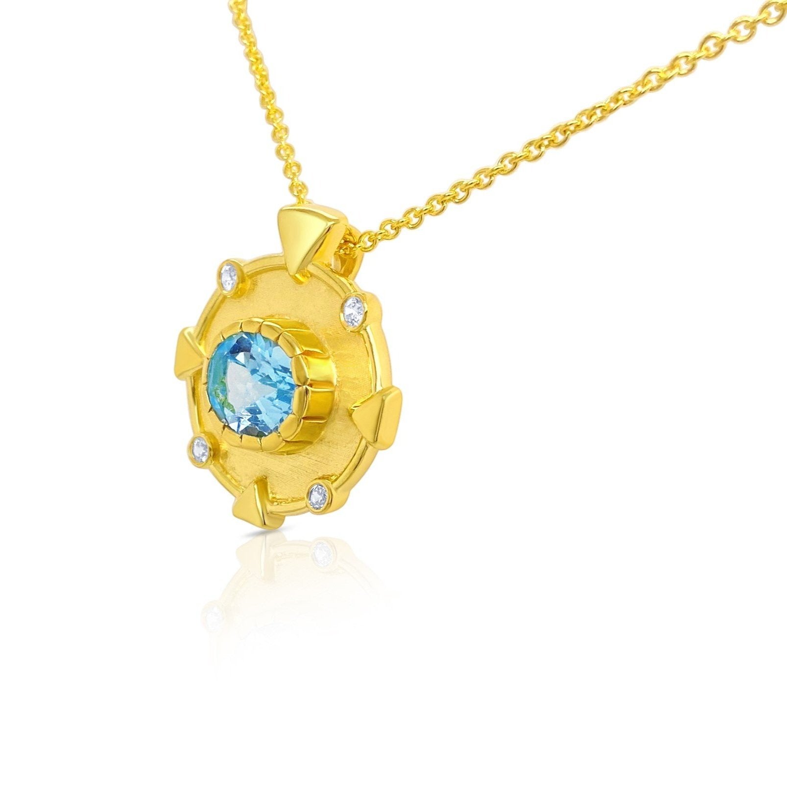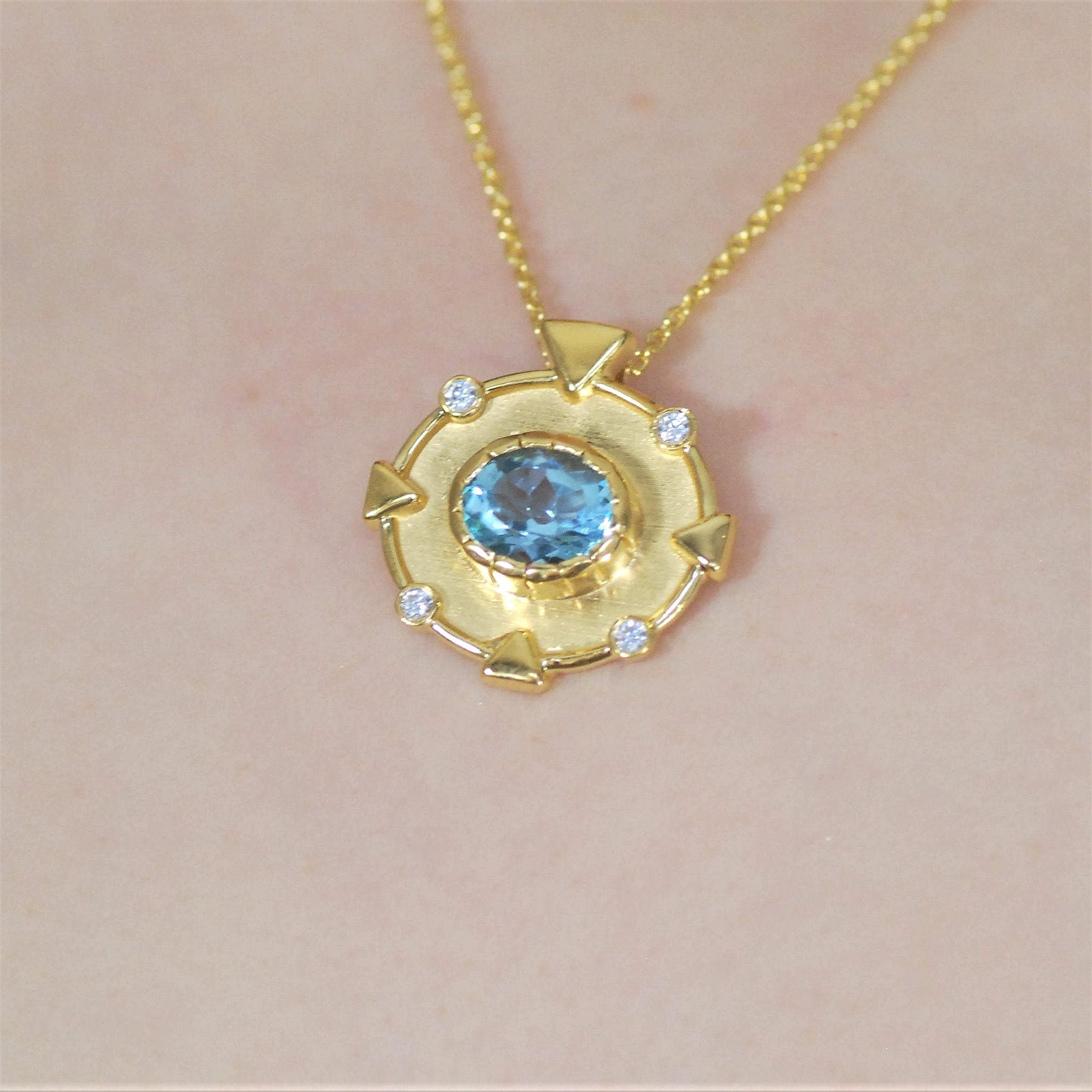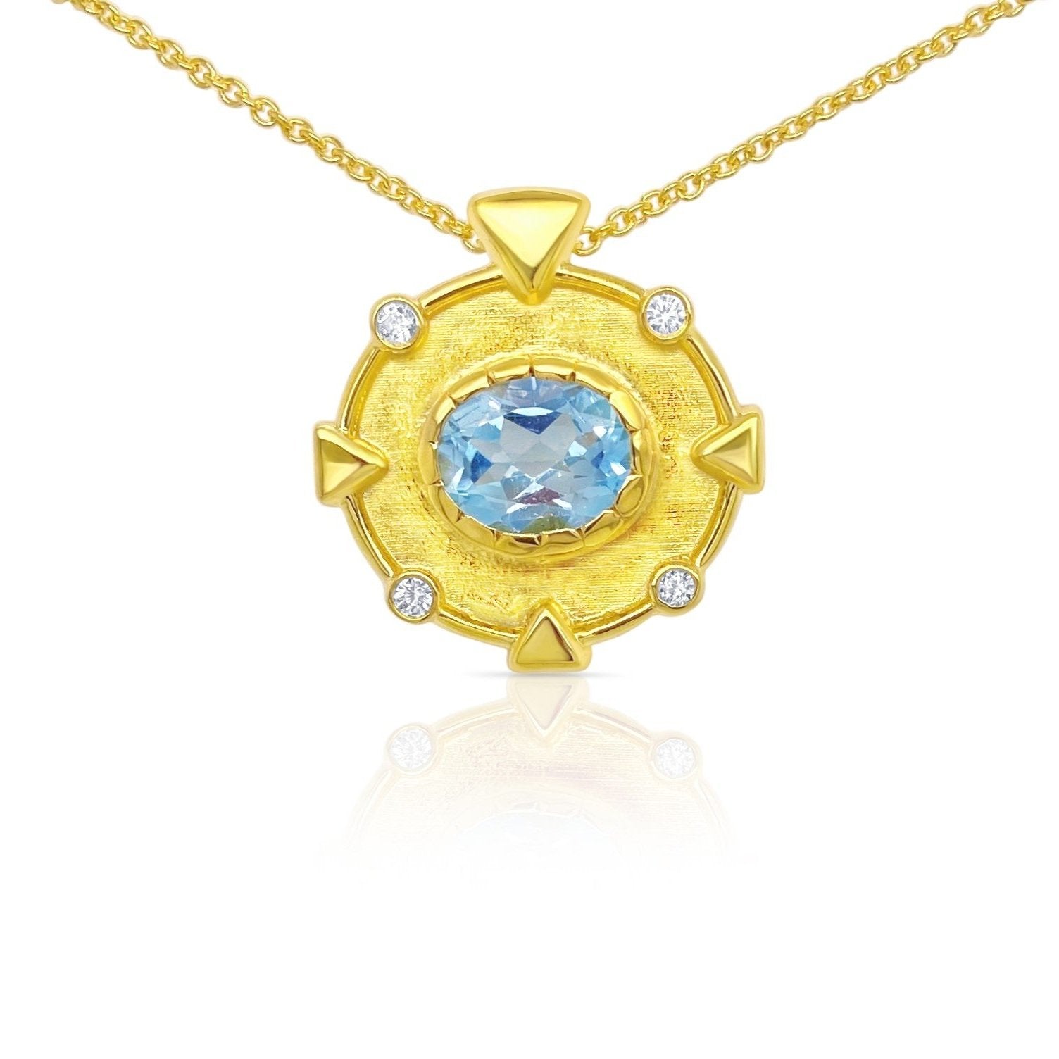 The large, faceted blue topaz at the centre of this pendant is stunning.  Held in place by 16 flat posts in an oval disc of gold with 4 cz's and 4 triangles on the rim of the disc.