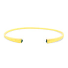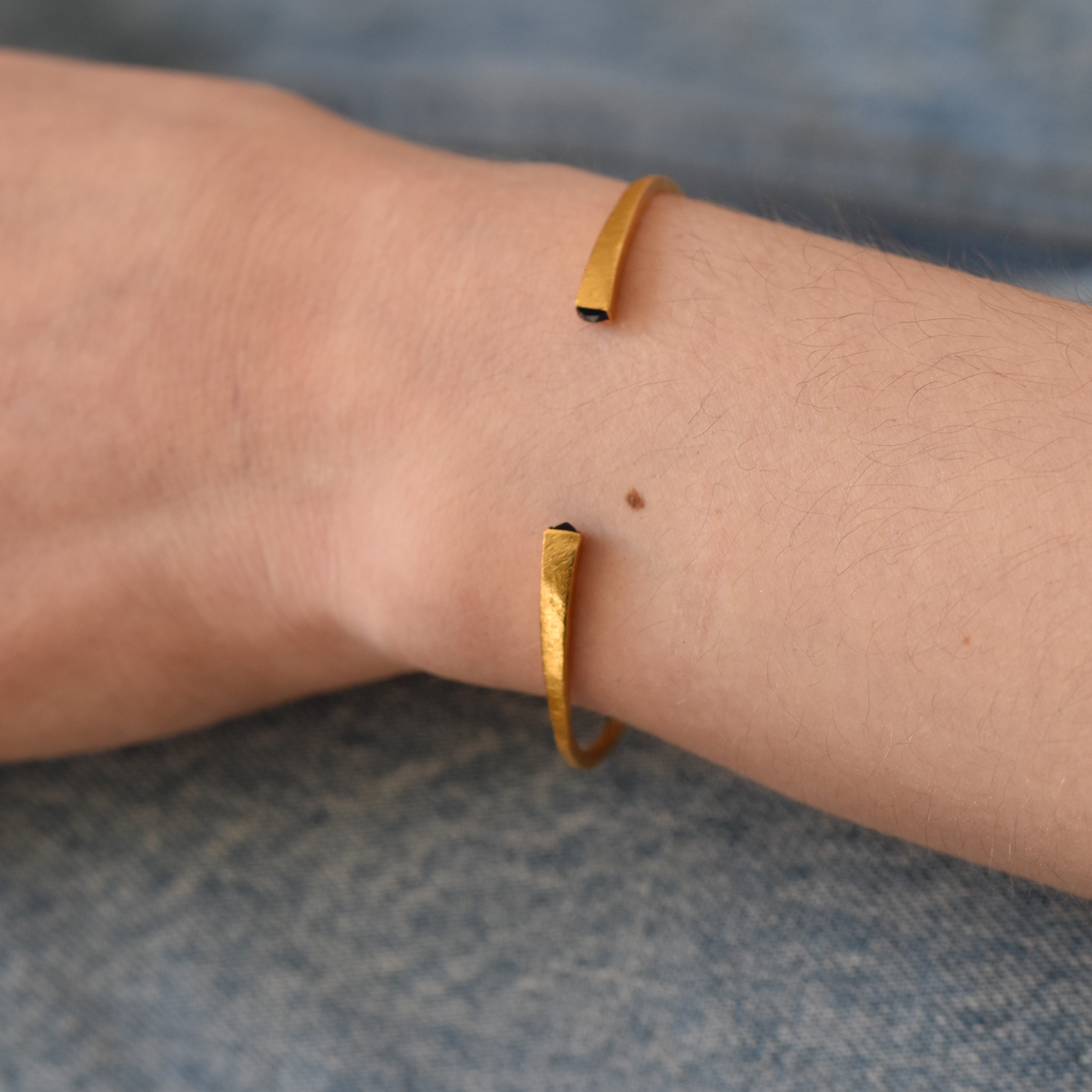 Discover the charm of these exquisitely simple gemstone bracelets.  Each piece features a broadening band of textured brushed gold, adorned with a petite dark blue quartz gemstone nestled into the square tip of the bracelet's wider ends.  The bracelet is fashioned to fit snugly around the wrist, and slips on sideways.  Though they look delicate this bracelet is actually strong.