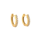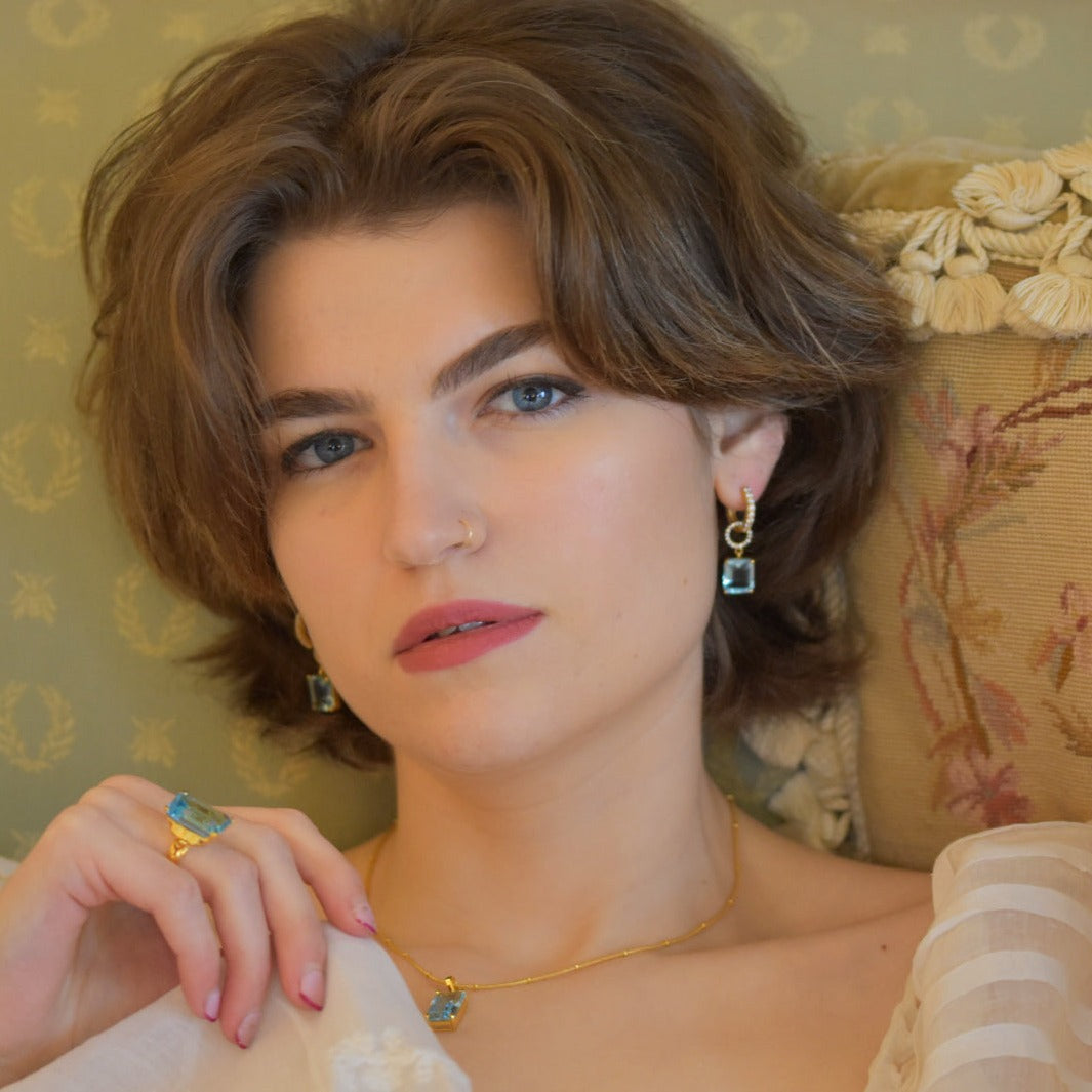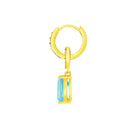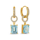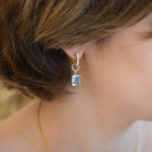 A beautifully faceted rectangle of blue topaz, held securely with four delicate claws, dangles elegantly from a small circlet of sparkling cubic zirconia, often known as "poor man's diamonds." This hangs from a huggie hoop, also studded with cubic zirconia offering a classic and timeless aesthetic. What's more, the huggie hoops can be removed and worn on their own or with other drops, making these 'two-for-one' earrings incredibly useful and versatile.