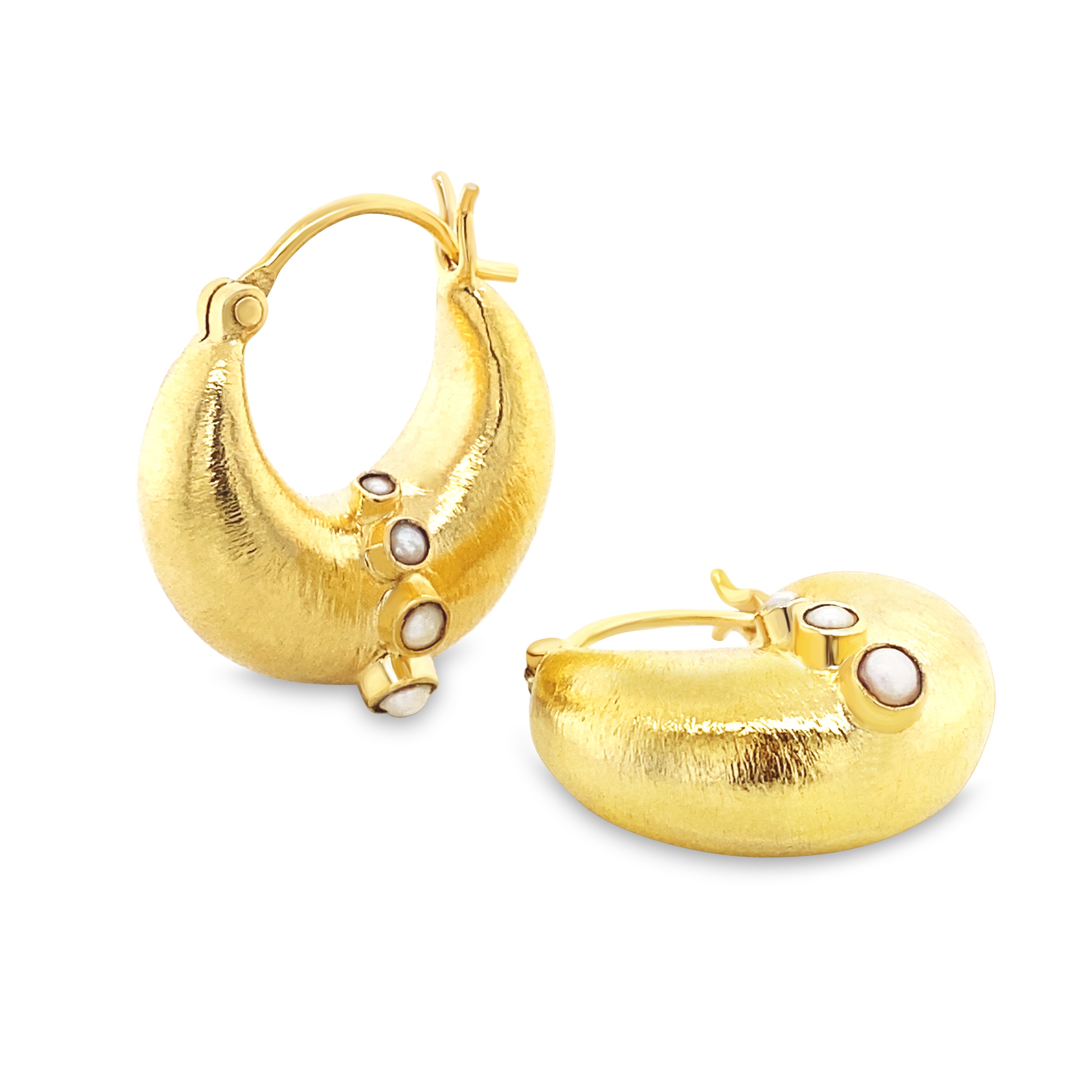 These gorgeously bold and generous earrings are shaped like cashew nuts, adorned with four graduated pearls, each nestled within its own bezel, marching up the middle! A small toggle fastens them behind the ear for secure wear.
