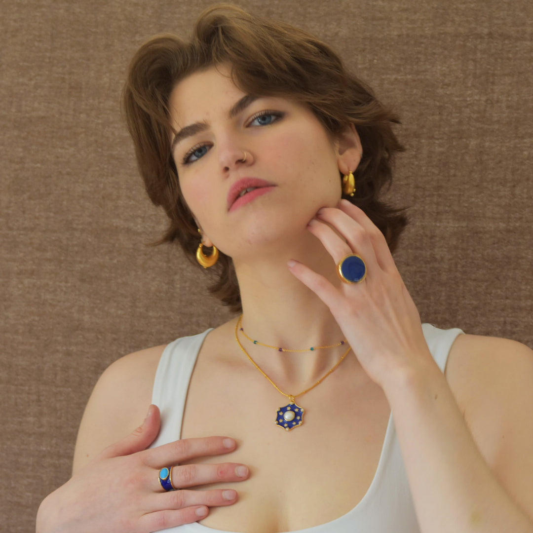 Our pieces are handmade in Jaipur, a city where jewellery is not just worn, but revered. Working closely with a small team of skilled artisans, we honour both heritage techniques and modern forms. Every detail is considered. Every gemstone placed with care. The result: jewellery that holds emotion, energy and elegance.