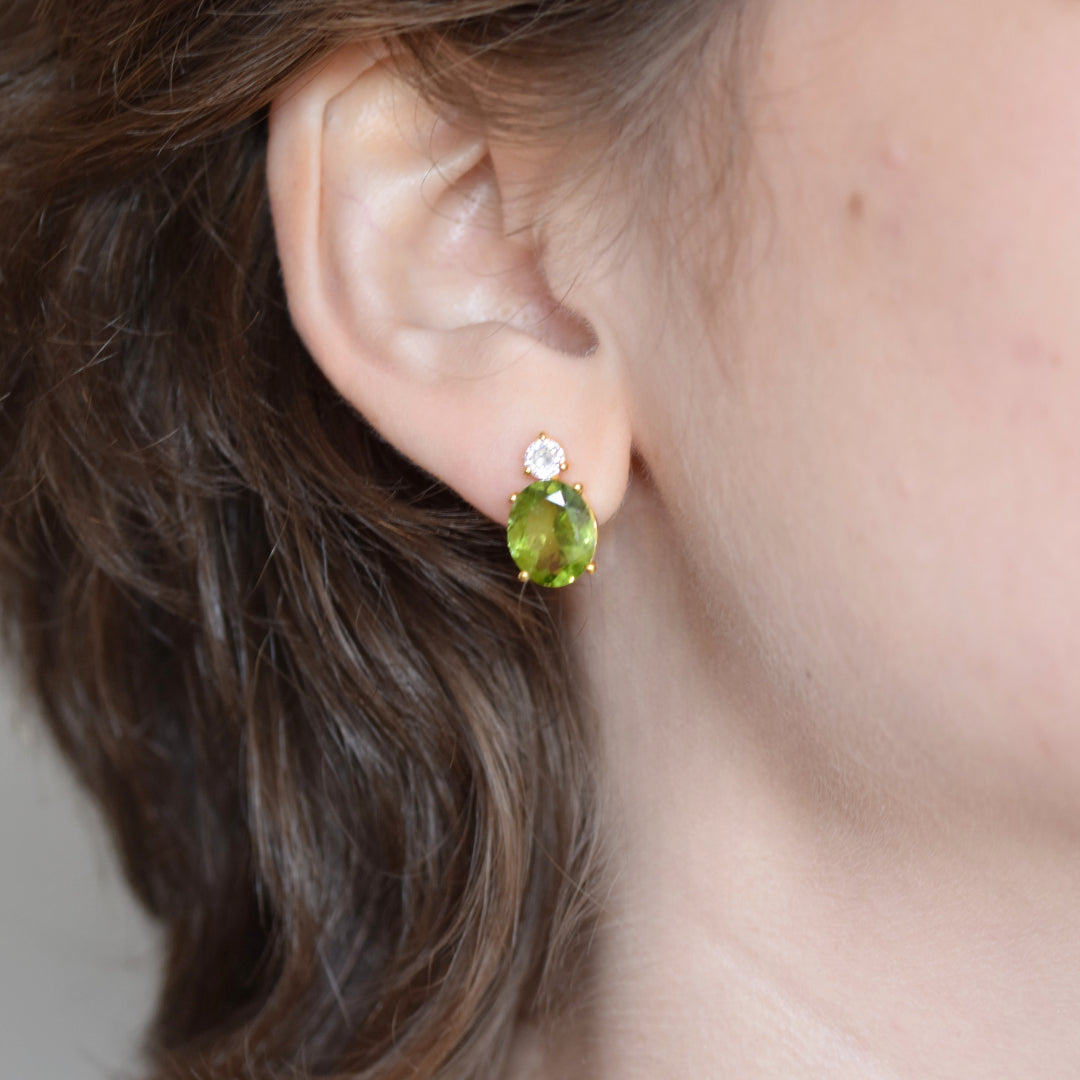 Each earring is crafted with meticulous care, featuring an oval-shaped, beautifully faceted peridot gemstone secured by four claws, and topped with a small cubic zirconia, held by three delicate claws, for added sparkle.