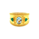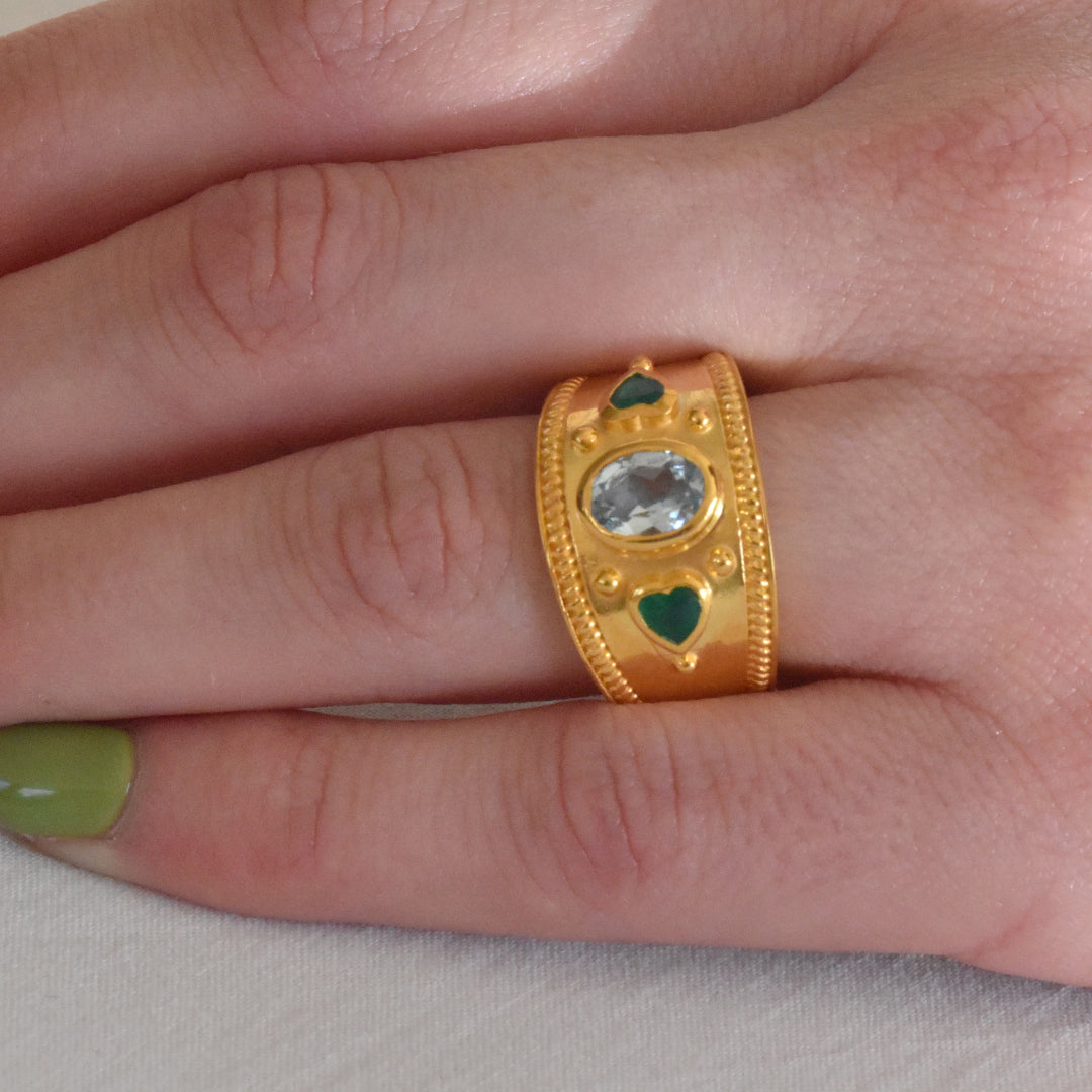 The Coronation Ring is an exquisite symbol of love and fidelity. A wide-band, gold ring with a rope edge, an oval of blue topaz and two small heart shaped green onyx gemstones. Four small decorative gold balls surround the central stone adding an elegant touch, making this ring a truly striking addition to any jewellery collection.