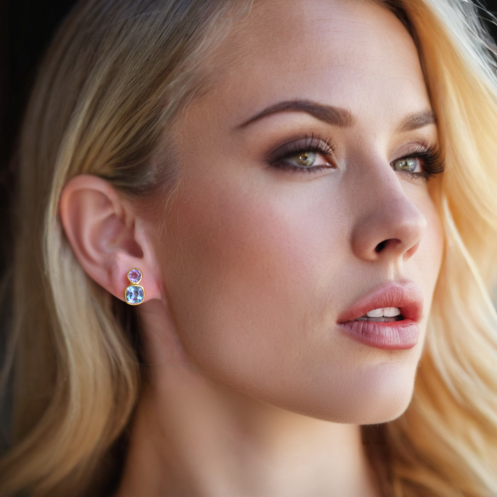 These earrings are a perfect blend of delicacy and sophistication, featuring a stunning and unique color combination, pairing blue topaz with amethyst.