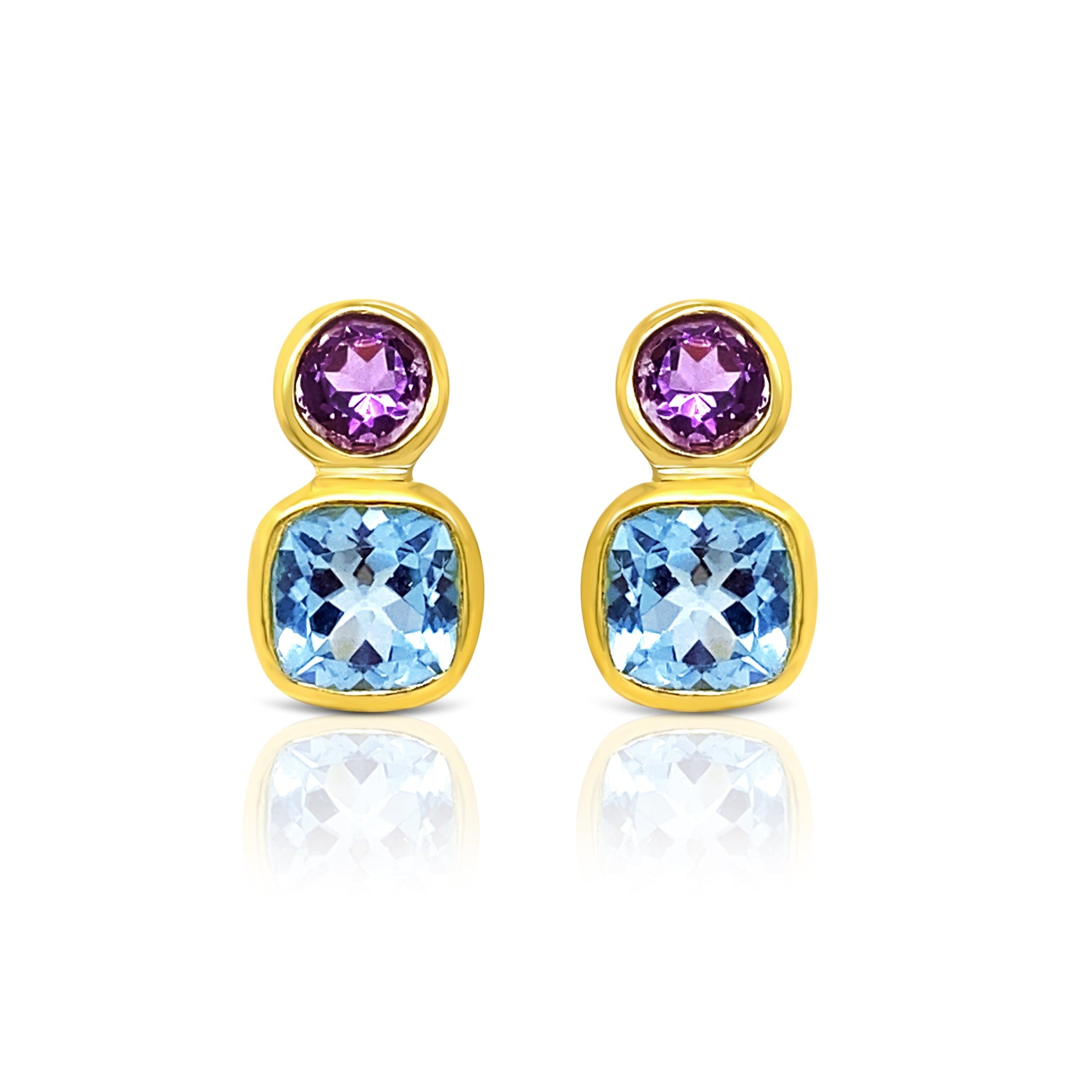 The blue topaz and amethyst are set in fine gold bezels, showcasing their beauty while keeping the earrings light and comfortable to wear. The hypoallergenic post is positioned between the two stones, ensuring the earrings sit elegantly on the ear. Crafted from 925 sterling silver with one micron of 18k gold vermeil and designed to last.