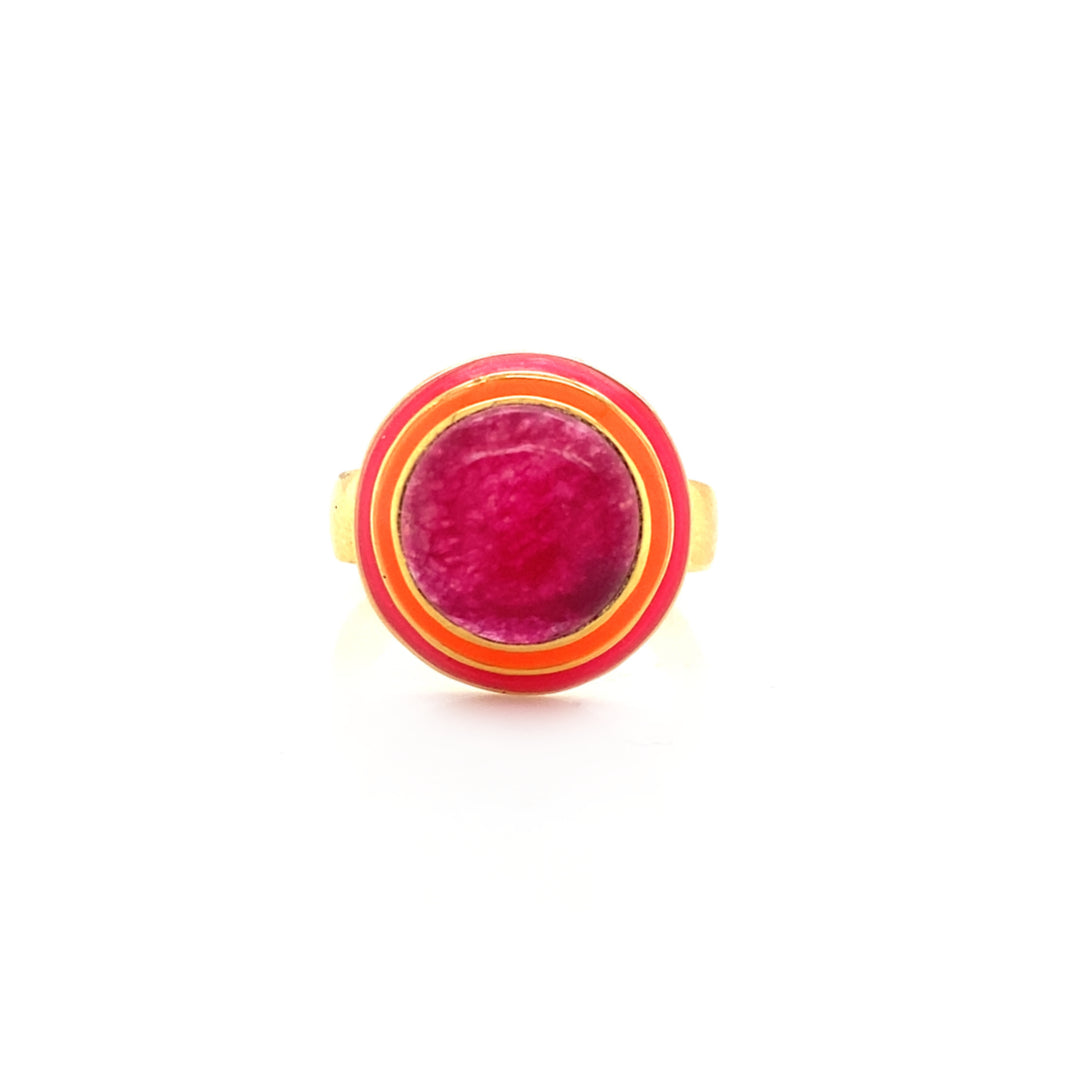 At its center lies a large cabochon dome of vibrant fuschia chalcedony. Surrounding the gemstone is a wide double rim of enamel, in shades of bright orange and vermillion, each separated by a delicate gold rim. The generous band that encircles the finger adds to the ring's comfort and fit.