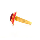 The fuschia chalcedony gemstone is 14mm and each enamel band is 2mm. The ring weighs 7g.  The metal is recycled brass with 2.5 microns of recycled 18k gold so the gold is extremely long lasting and durable.