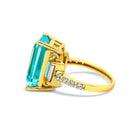 This utterly stunning ring with its divine sky blue topaz gemstone is masterfully faceted in an emerald cut that maximizes its brilliance and hue. Set with four claws in a decorative mount, the blue topaz is flanked by two baguettes of white topaz, elegantly held in place by four claws. Down the band, small cubic zirconia gems sparkle.