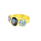 Three stunning topaz stones sit in individual bezel settings with elegant rubover edges. At the centre lies a striking London blue topaz with its rich, sapphire-like depth of colour. Flanking it on each side, two sky blue topaz stones are highly faceted to catch the light beautifully, creating a perfect contrast to the dramatic central gem.