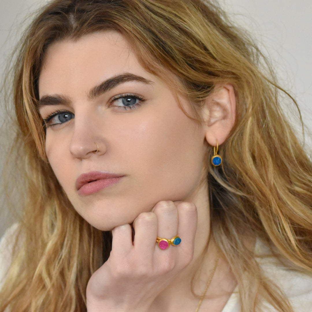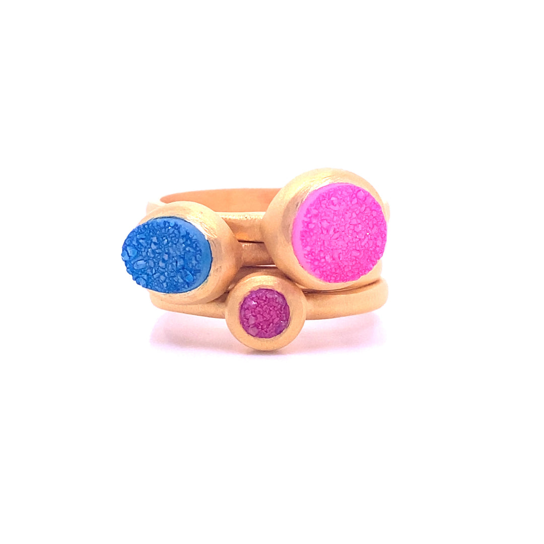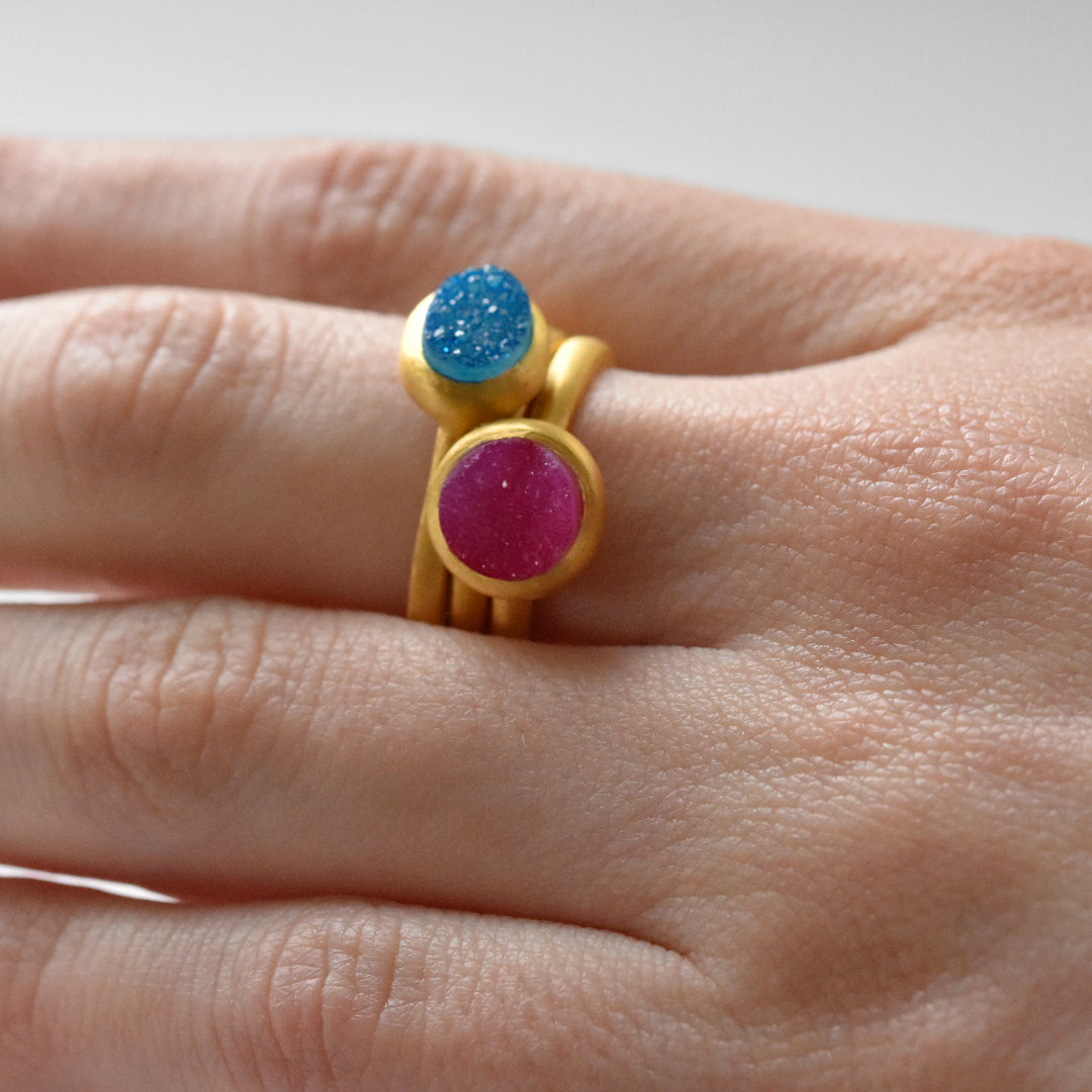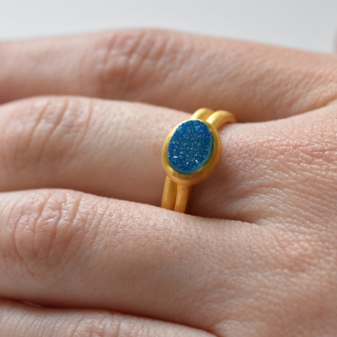 Druzy is a fabulous stone. It has a gorgeous crystaline texture combined with its bright turquoise blue colour and detailed brushed gold vermeil setting, this stunning stacking ring will have you feeling cooler than cool!
