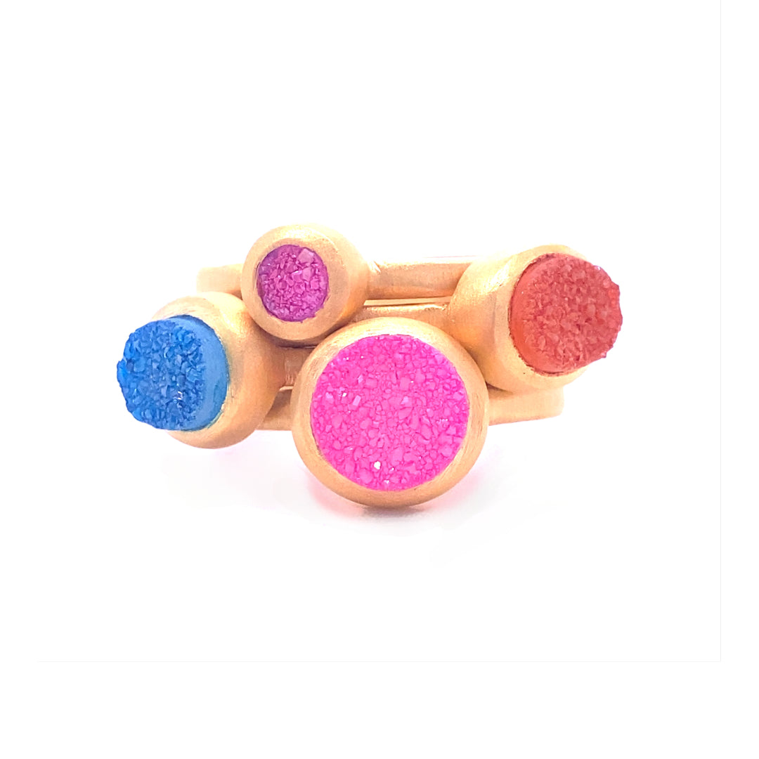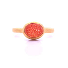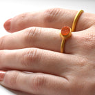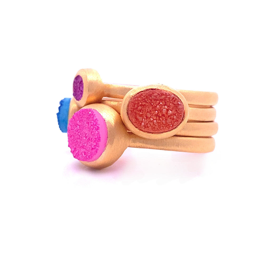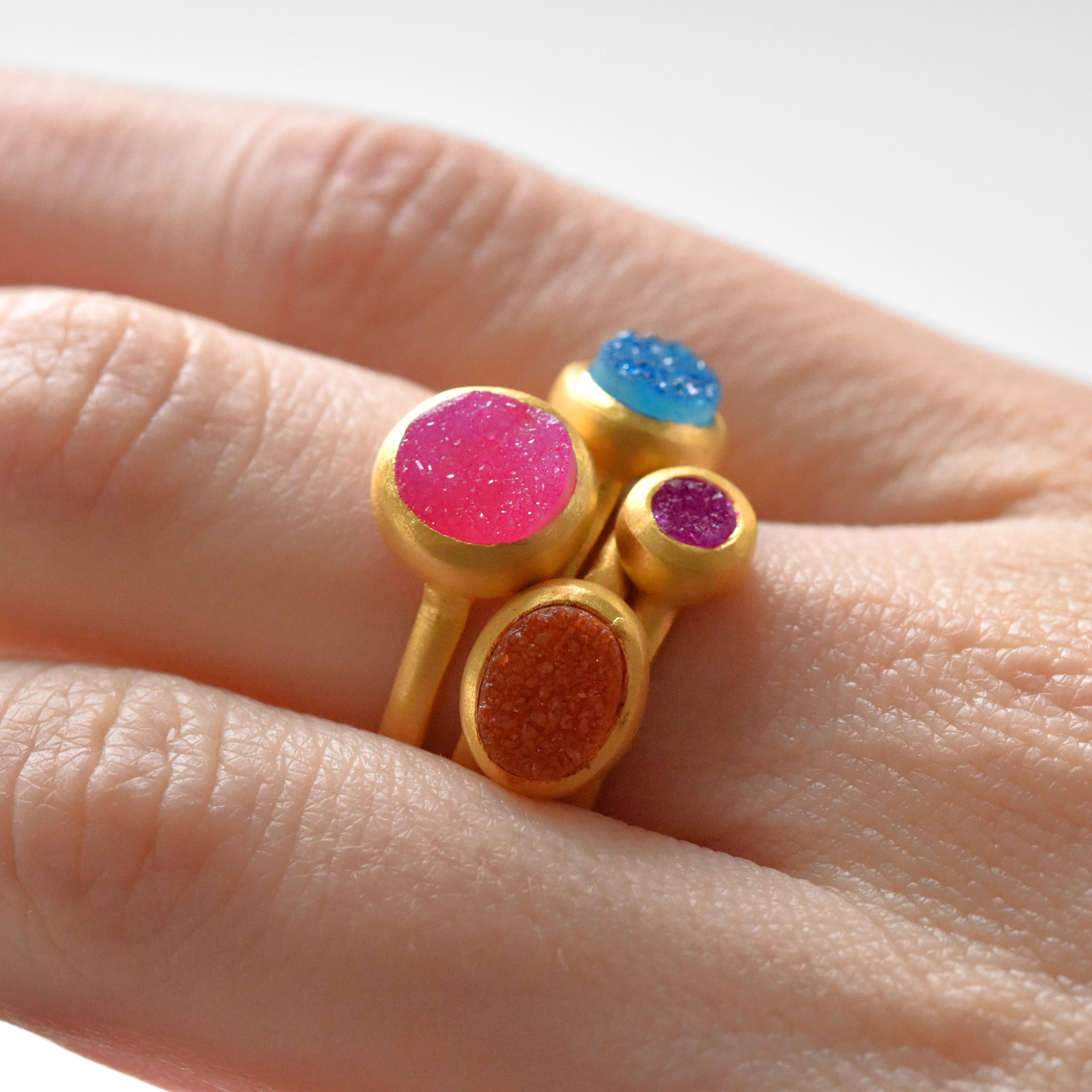 The Balls of Fire Ring in orange druzy is hotter than hot! Druzy is a fabulous stone. It has a gorgeous crystaline texture combined with its bright orange colour and detailed brushed gold vermeil setting, this stunning stacking ring will have you feeling cooler than cool!