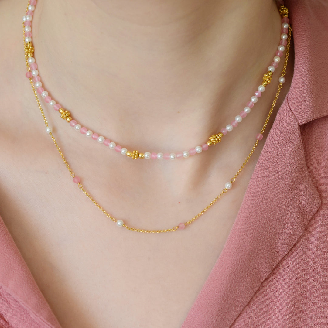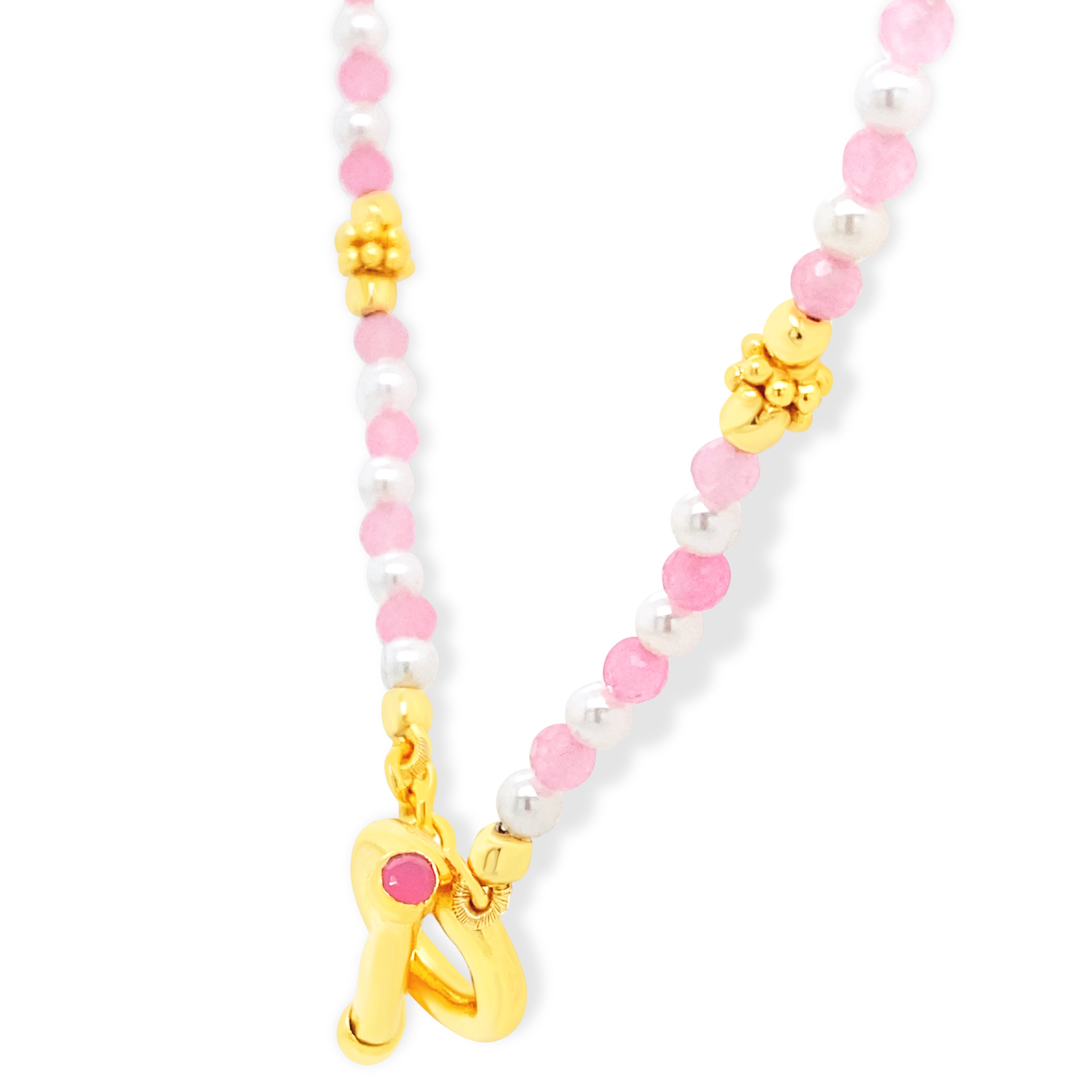 This delightful toggle bead necklace is part of our fabulous mix and match Bead Collection, offering a versatile range of necklaces, earrings, and bracelets. Featuring alternating pink chalcedony and small round pearls, accented with decorative gold pieces and gold balls, this necklace exudes charm and elegance.