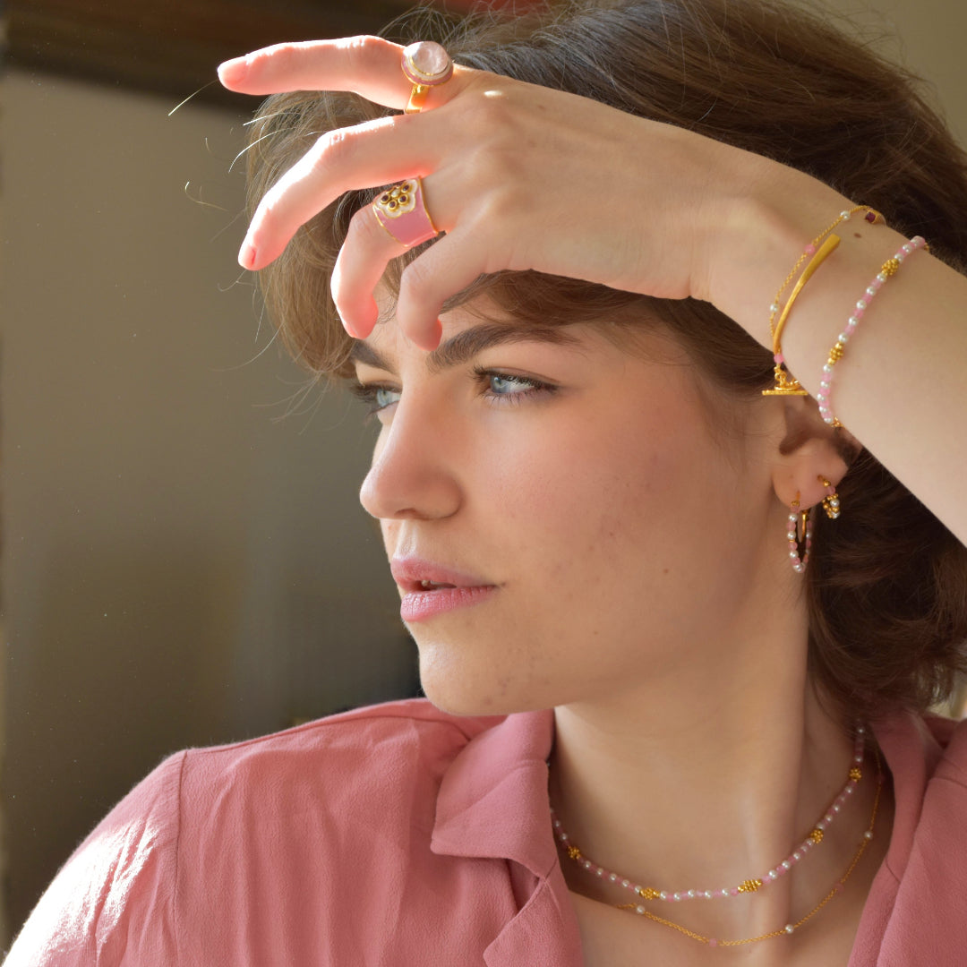 Fastened with a toggle that can be worn at the front or back, the toggle showcases a pink chalcedony bead at one end and a pearl at the other, adding a delightful design detail. Crafted from recycled brass with 2.5 microns of recycled 18k gold vermeil, this necklace not only boasts style but also contributes to environmental sustainability. With its sophistication and colourful artistry, it's destined to become a cherished addition to any jewelry collection.
