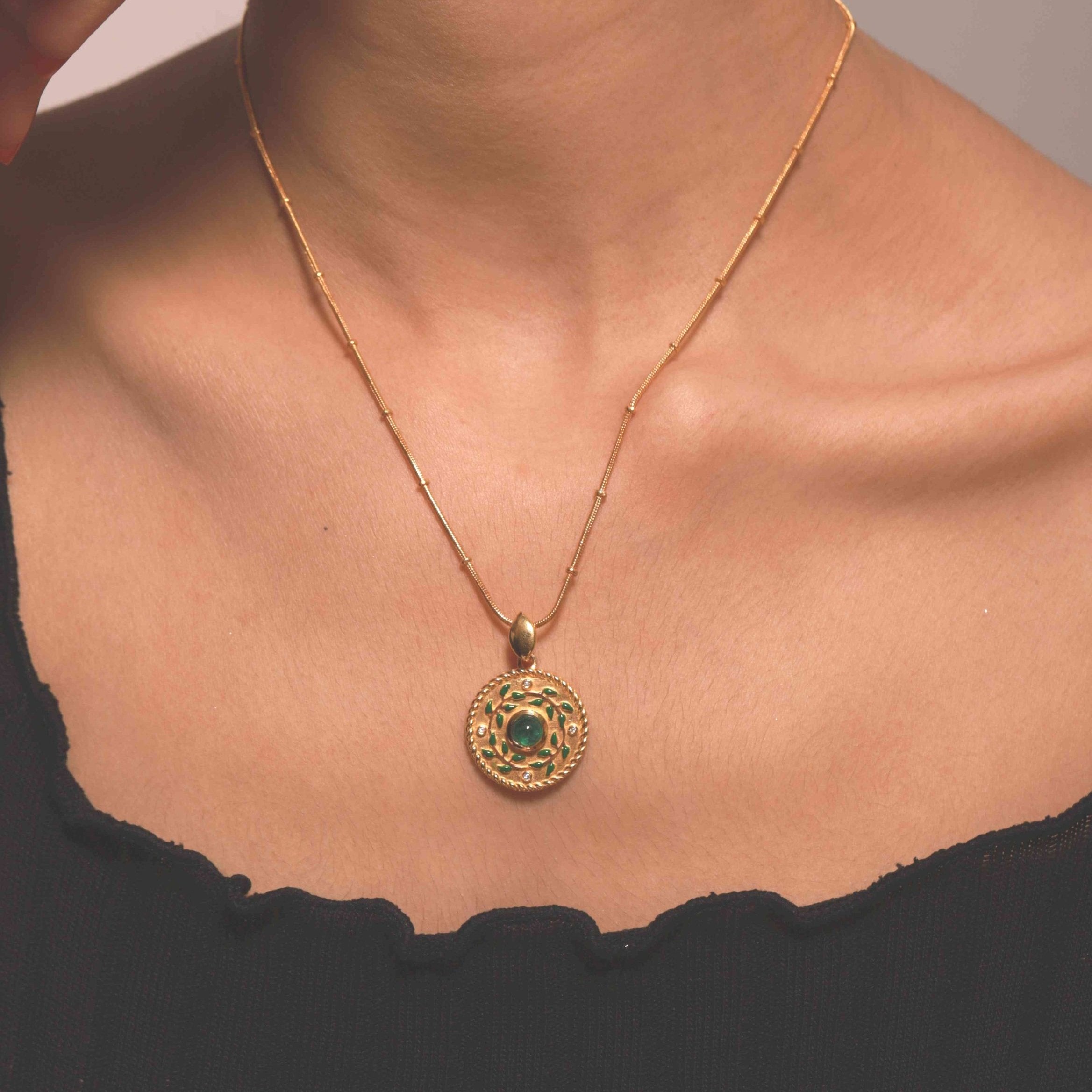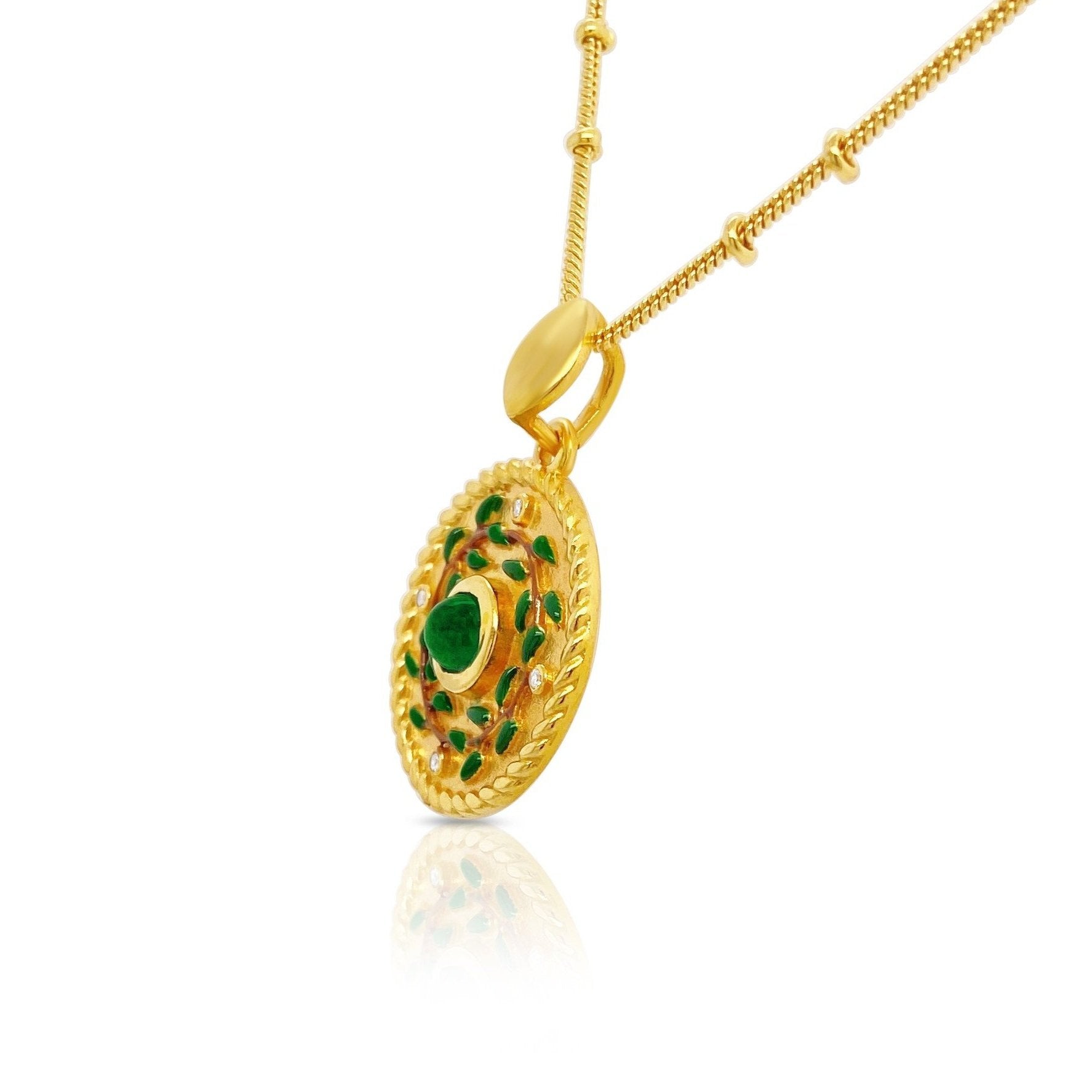 This pendant has a central, beautiful, rich green, cabochon emerald in a gold mount. Encircling it is an enamel branch with many tiny green enamel leaves winding off it, symbolising all that is growing. At the four points, north and south, east and west are four tiny cz’s. The pendant has a rope edge and an oval shaped hook. It is very beautiful.