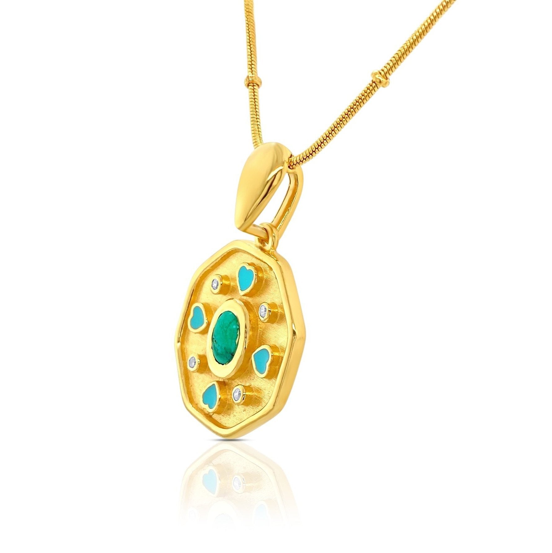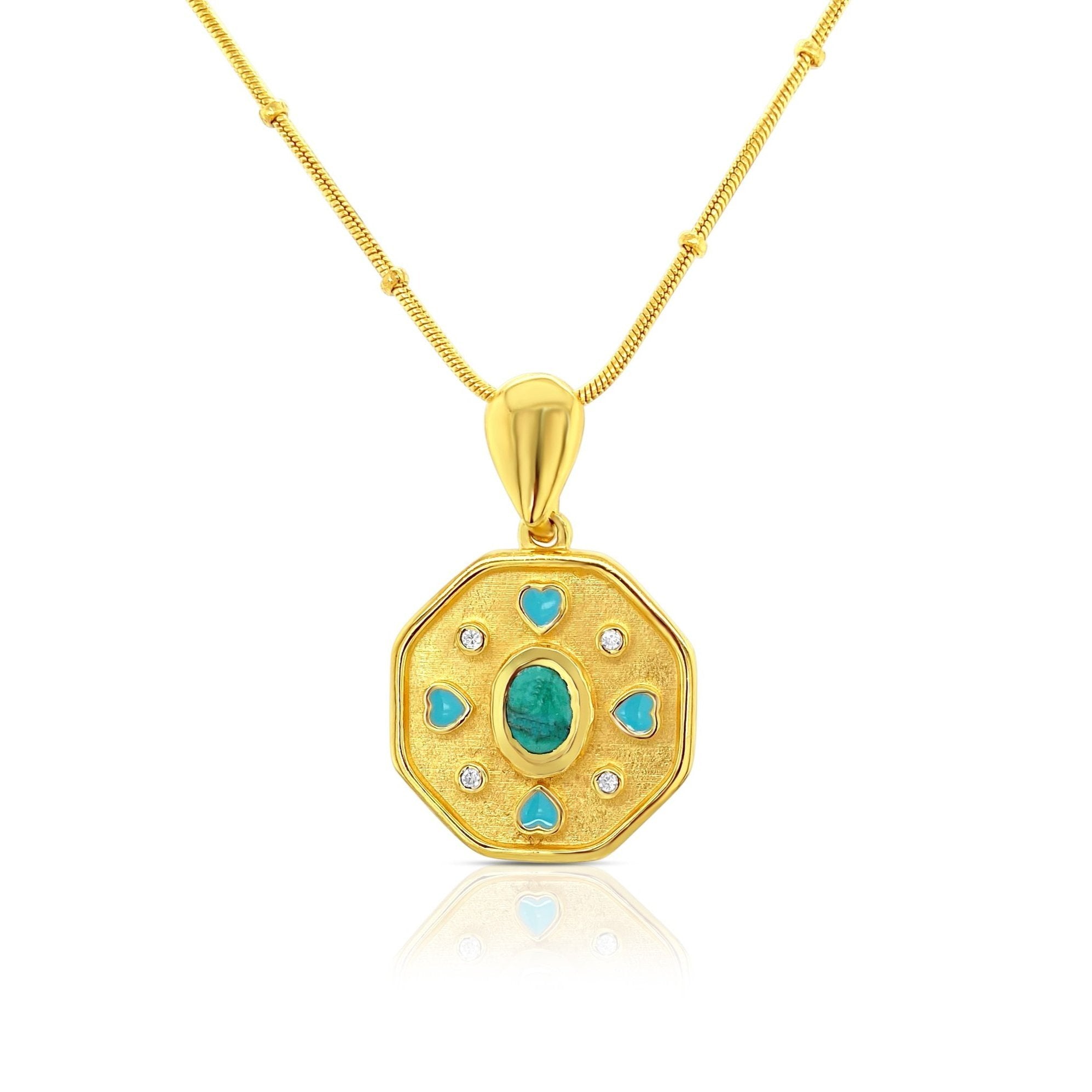 This pendant has a central oval of cabochon turquoise, symbolic of the archer's target, with four tiny turquoise enamel hearts expressing the love and freedom of those born in this month and four cz’s, with a plain rolled rim. A large gold tear drop holds the chain.