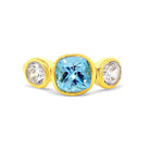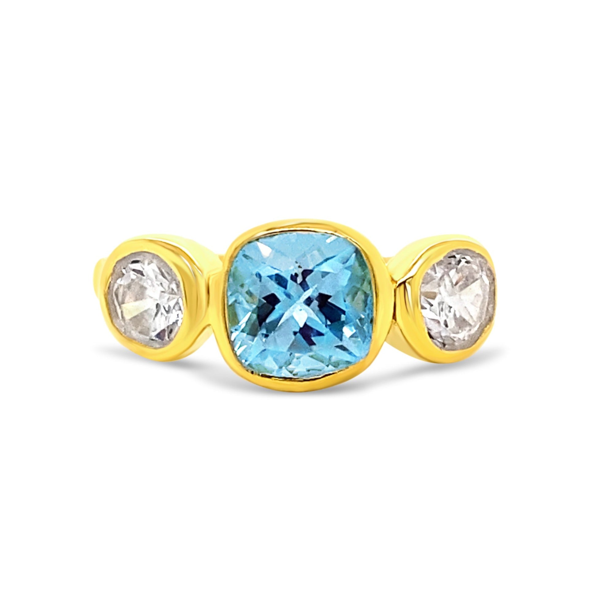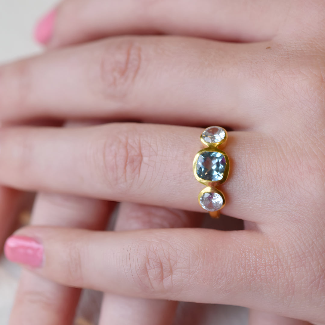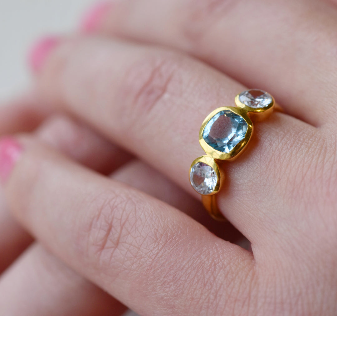 This is a wonderfully delicate ring in an incredibly beautiful and traditional combination of blue topaz and cz gemstones.  The stones are set in a fine gold vermeil bezel and it sits very comfortably on the hand.