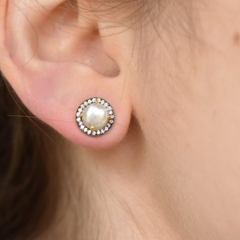 A central, beautiful baroque pearl of about 6mm, sits in a circular band of tiny ‘poor man’s diamonds’, otherwise known as cubic zirconia, on an oxidised gold vermeil band. The earrings are made by hand, in the workshop in Jaipur.