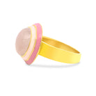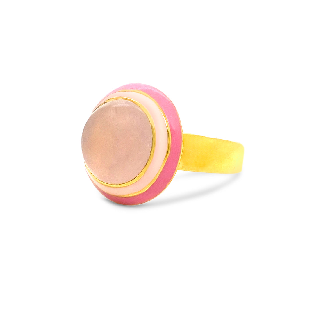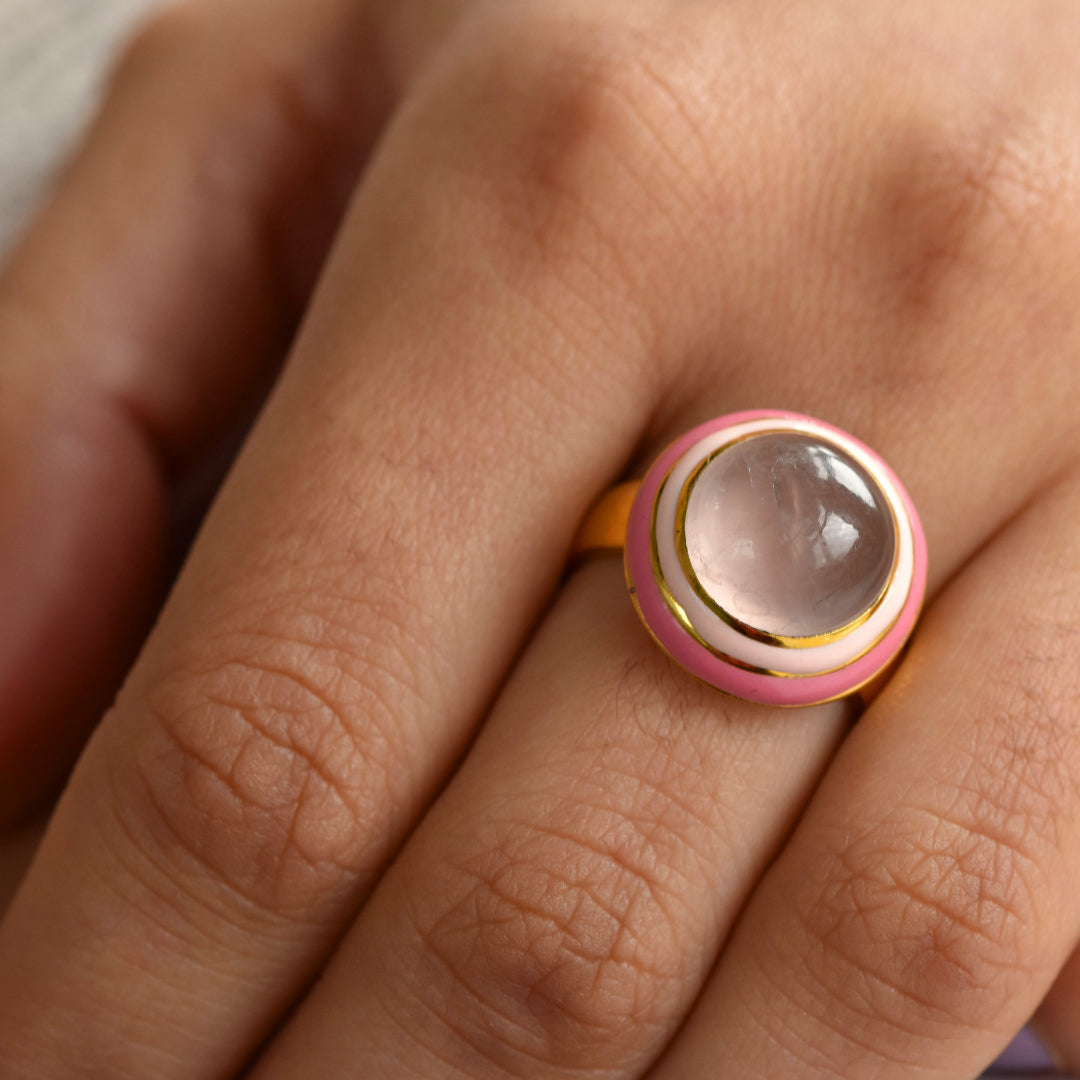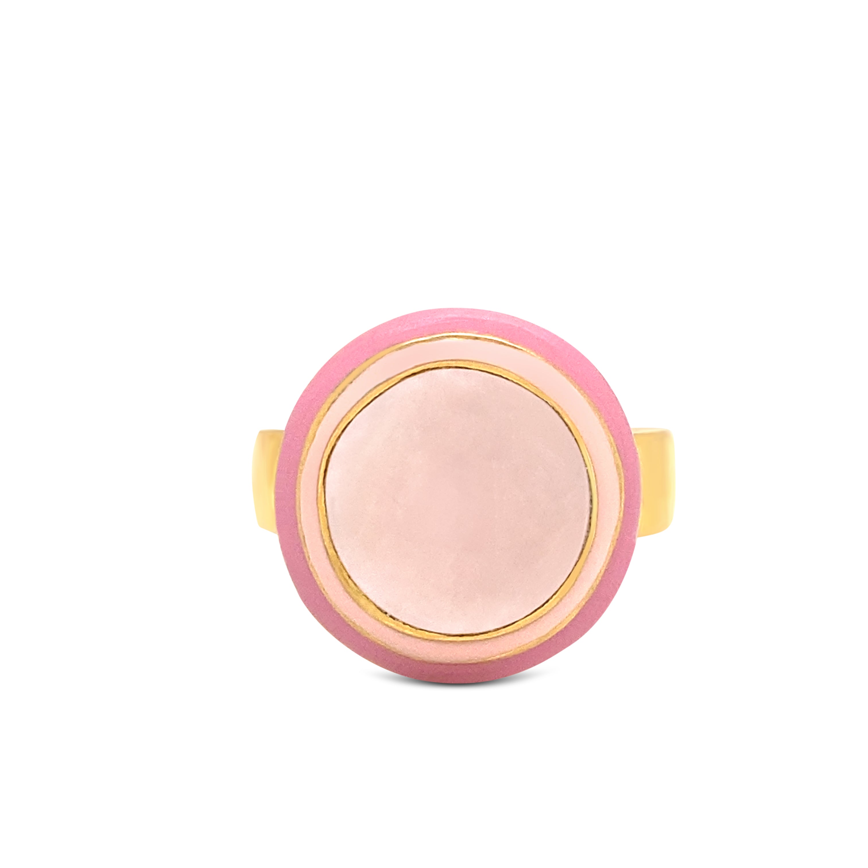 At its centre lies a large cabochon dome of soft rose quartz, catching your attention with its captivating hue. Surrounding the gemstone is a wide double rim of enamel, featuring shades of palest pink and deep rose, each separated by a delicate gold rim. The generous band that encircles the finger adds to the ring's comfort and fit.