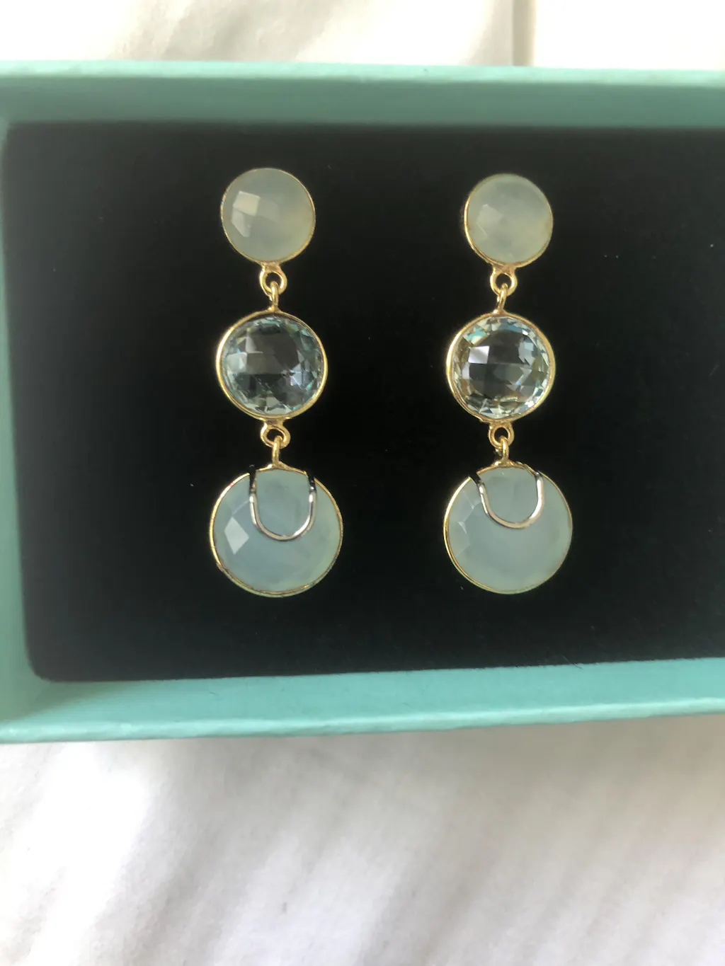 Three faceted, round, graduated gemstones, with the top stone a stud and the others freely hanging from it. The top and bottom stones are aqua chalcedony and the middle stone is blue topaz.