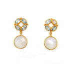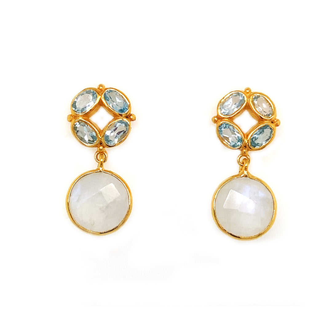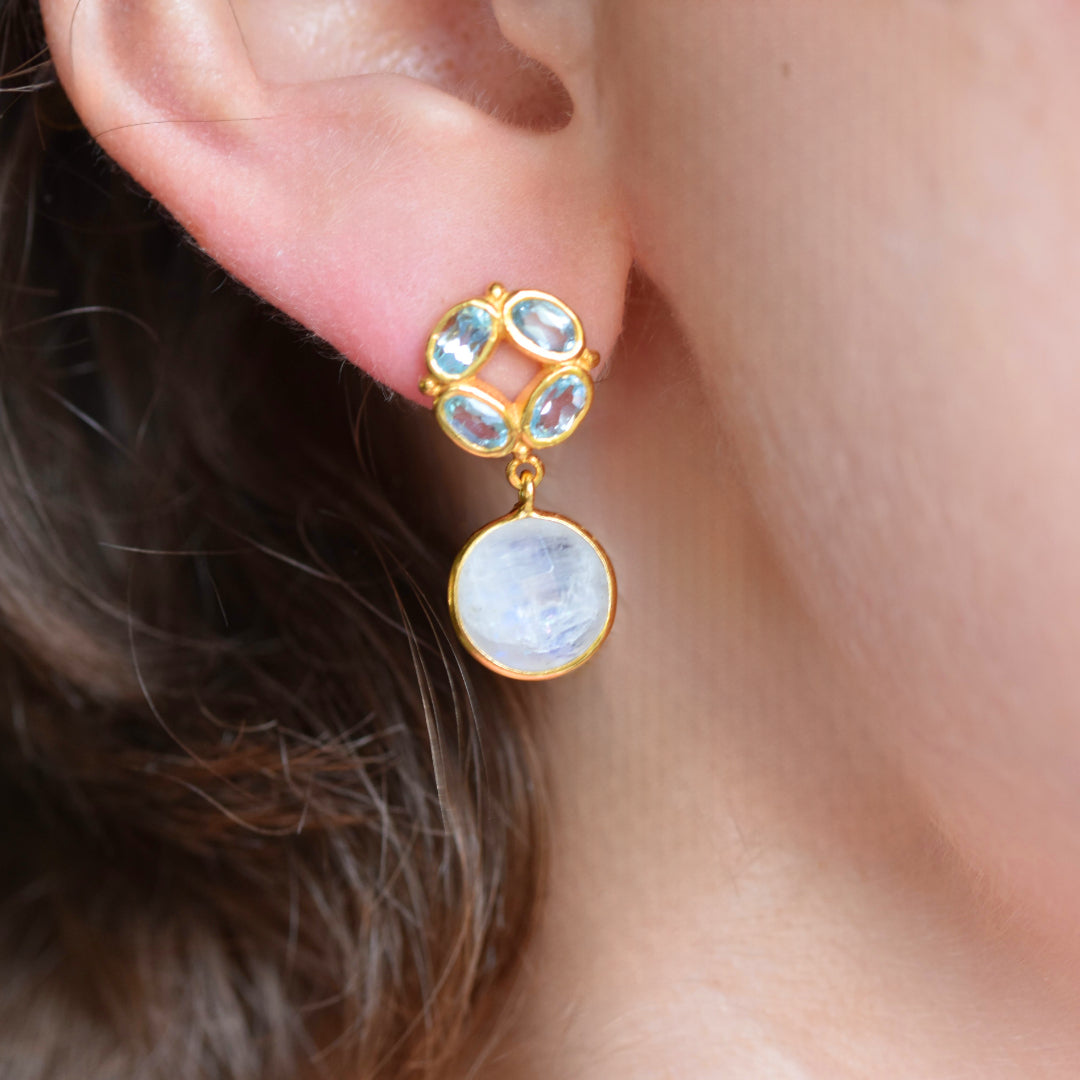 These earrings are a celebration of exquisite colors and elegant design. Four brilliant oval blue topaz gemstones are expertly set in a circlet of delicate gold wire, with a tiny gold ball nestled between each stone. Below, a faceted round moonstone dangles gracefully from a delicate jump ring, adding a touch of ethereal beauty.