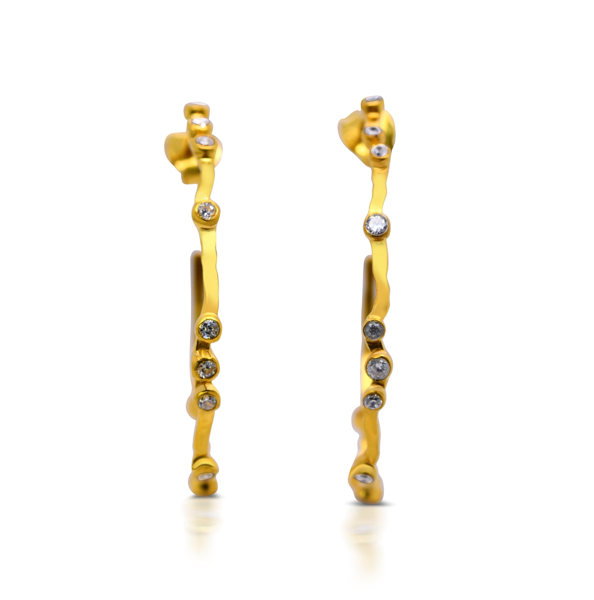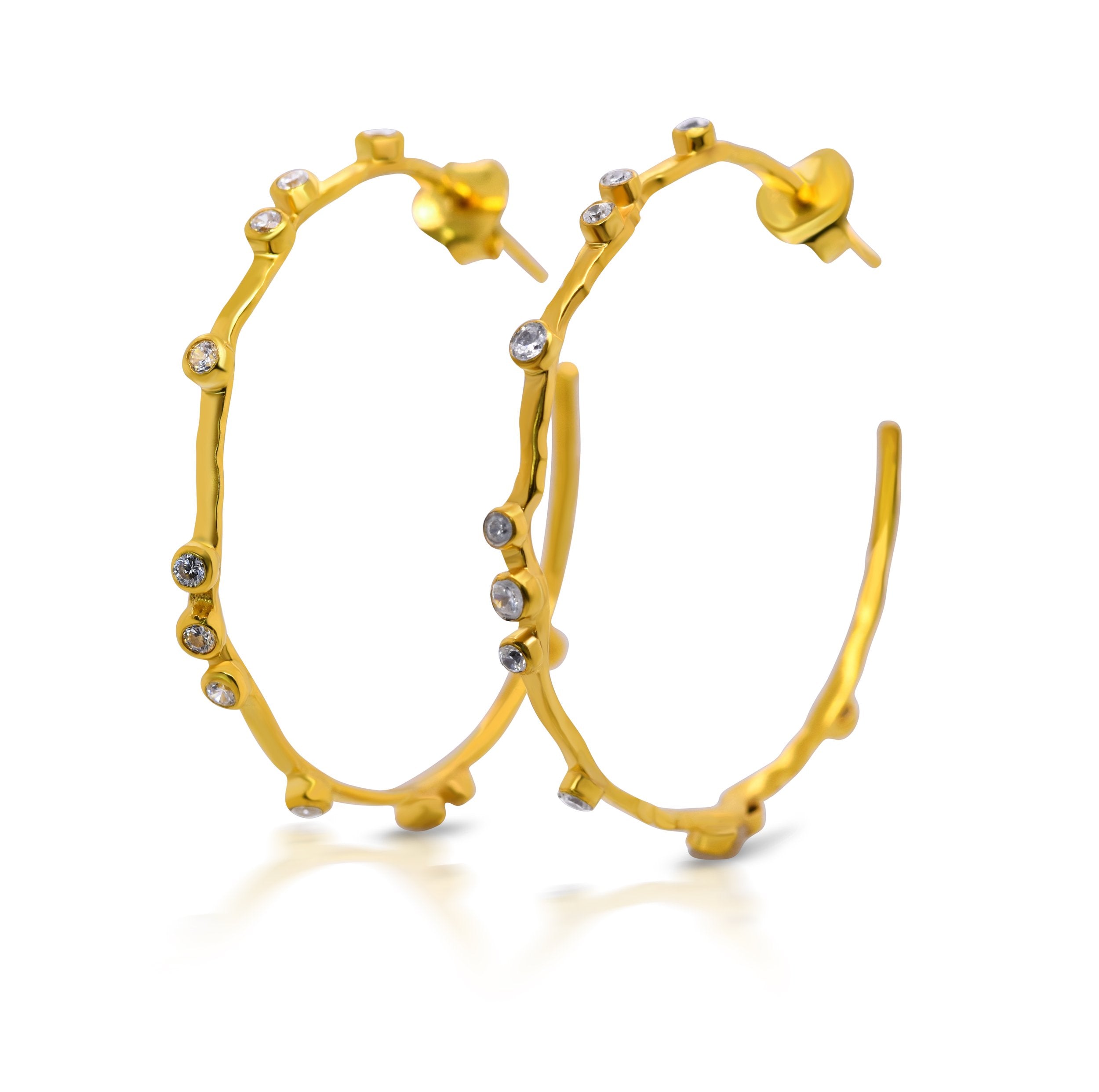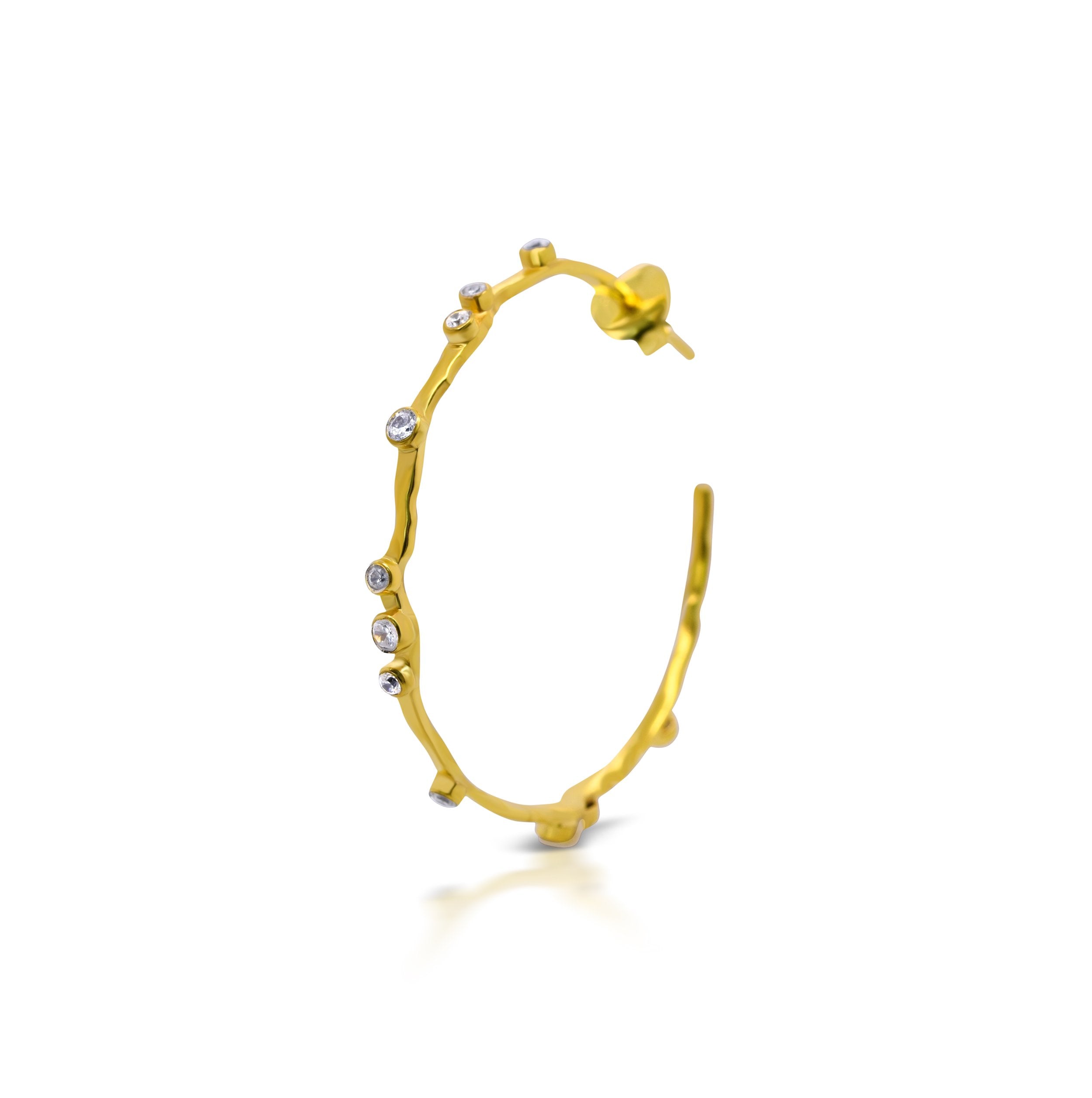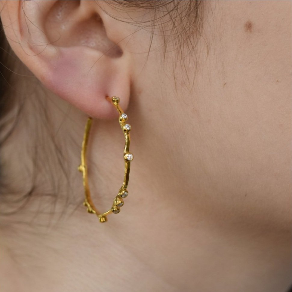 Large circles of organic ‘wavy’ gold with one, two or three cz’s set in groups around the hoop.