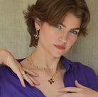 The amethysts are each set in gold bezels with a central gold disc holding them in place. The gems are rough cuts, meaning they are unpolished, which gives them a unique, organic charm and emphasizes their natural beauty and hue, while making each pendant truly one of a kind. This not only adds to its beauty but also makes the piece feel more personal and special to the wearer. The narrow snake chain with the tiny gold balls adds an extra layer of detail.