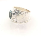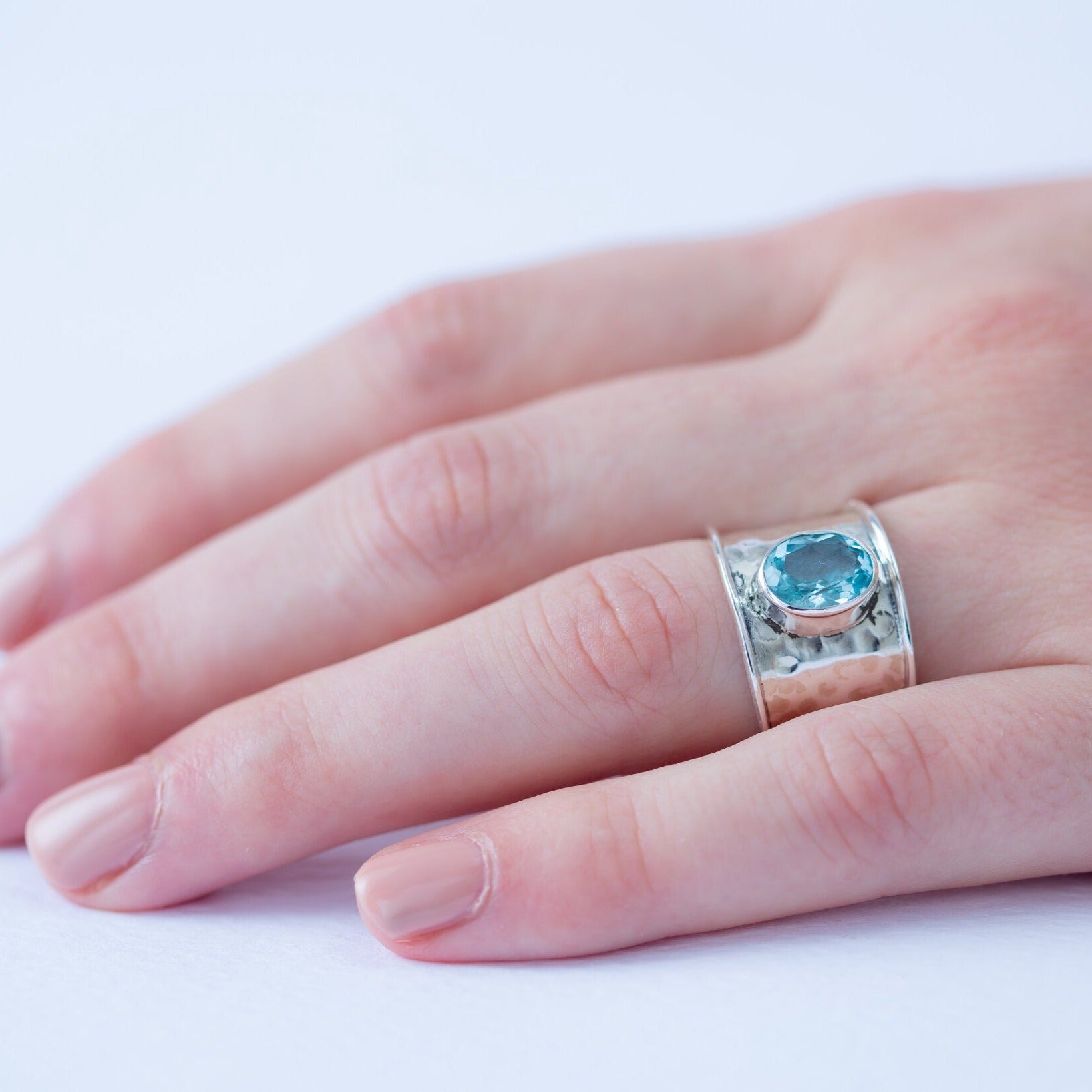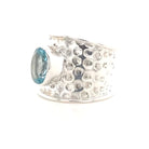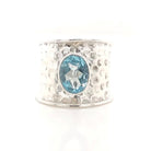 A broad band of recycled, hammered .925 sterling silver with a large faceted oval of blue topaz in the centre.