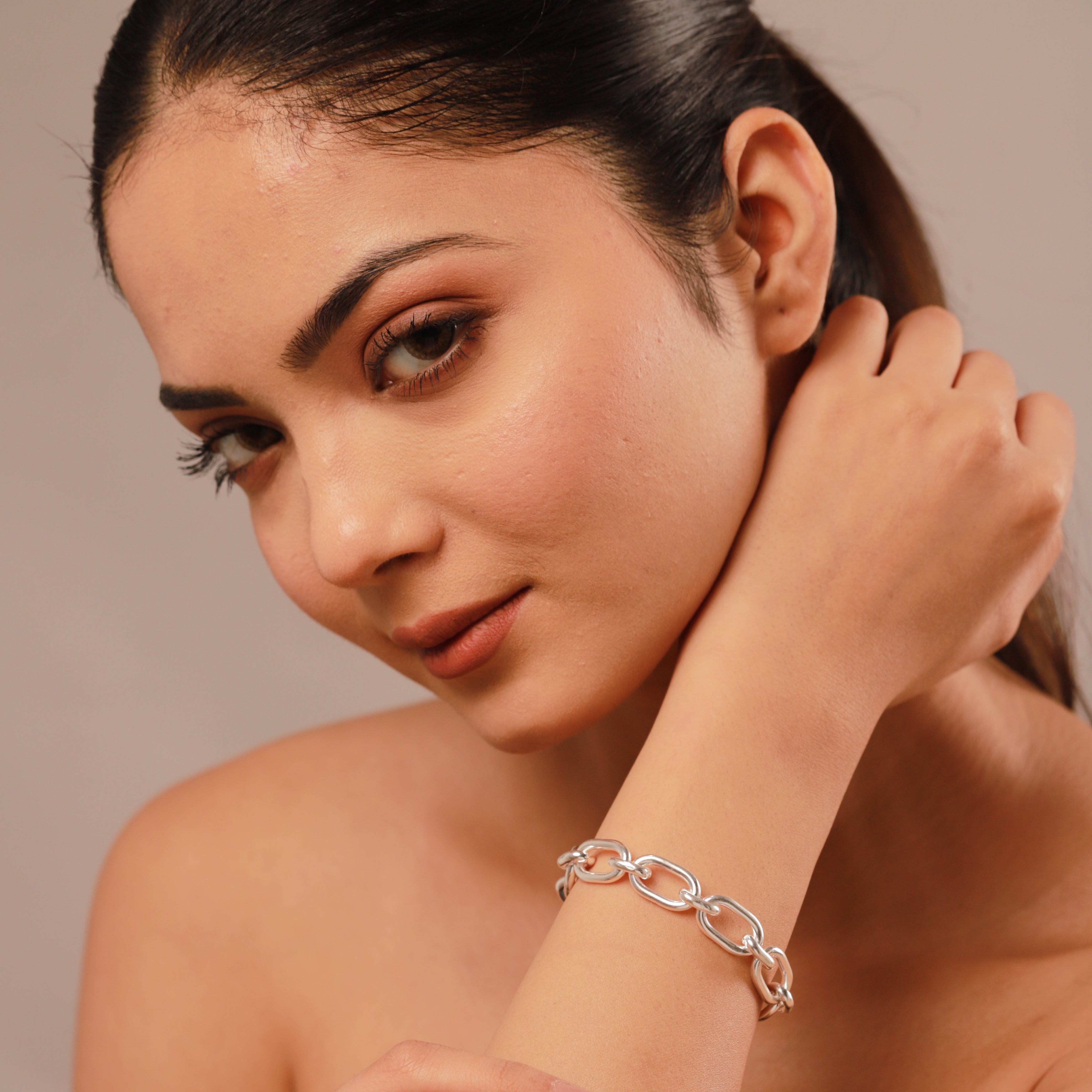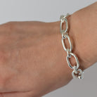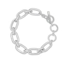 A large solid oval link is connected with a small oval link and the bracelet is fixed with a hammered silver toggle for easy fastening.