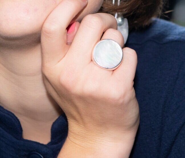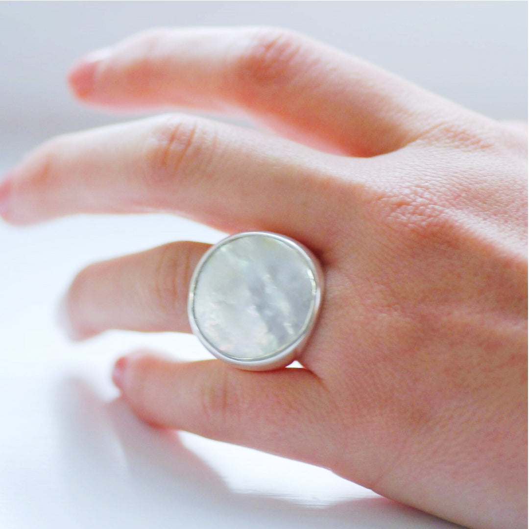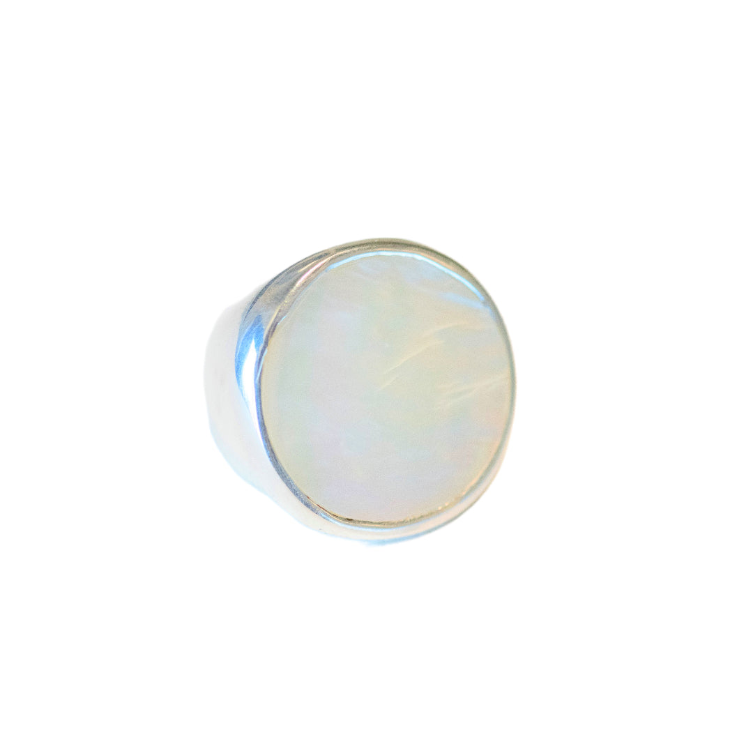 This ring has sold out several times, and it's no wonder. It's absolutely gorgeous, uber-modern, and wonderfully unique. The ring features a flat circle of stunning iridescent mother of pearl, with its creamy, translucent rainbow hues, set into a high polish, wide .925 sterling silver band.