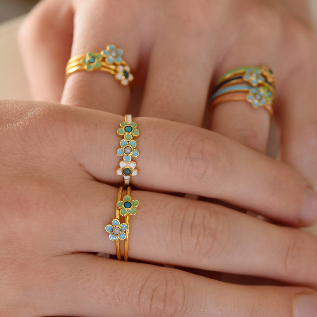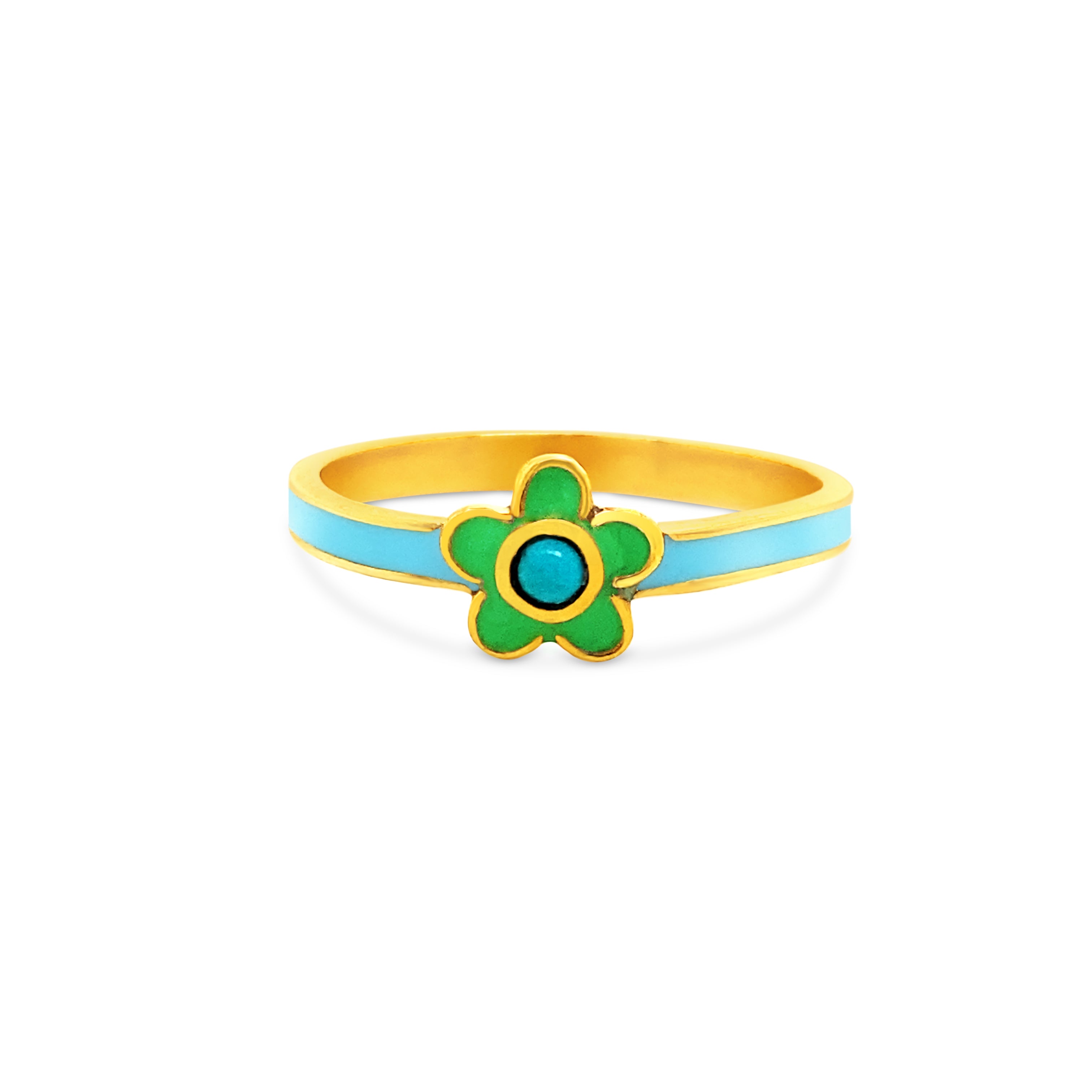 The Fleury Collection offers an enchanting array of rings, huggie earrings, and a necklace. At the heart of this ring is an adorable turquoise gemstone, nestled in a green enamel flower, set on a hand painted, turquoise blue enamel band.
