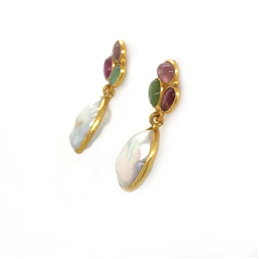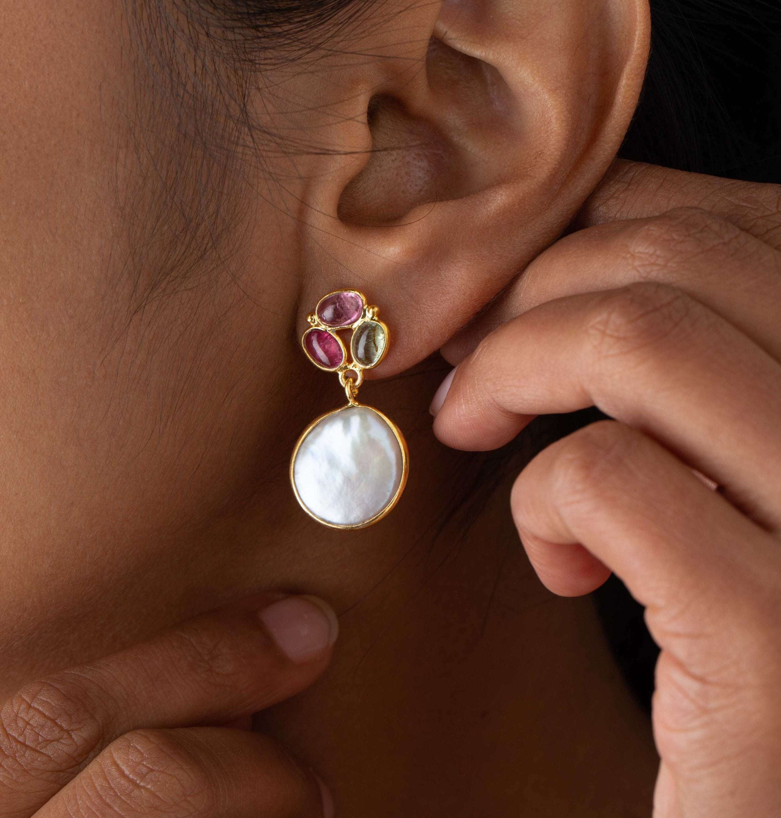 These earrings have been immensely popular, selling out faster than we can restock—and it’s easy to see why. The dreamy color combination of a creamy Keshi pearl circlet paired with delicate pink and green tourmaline “leaves” creates an irresistible design.