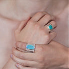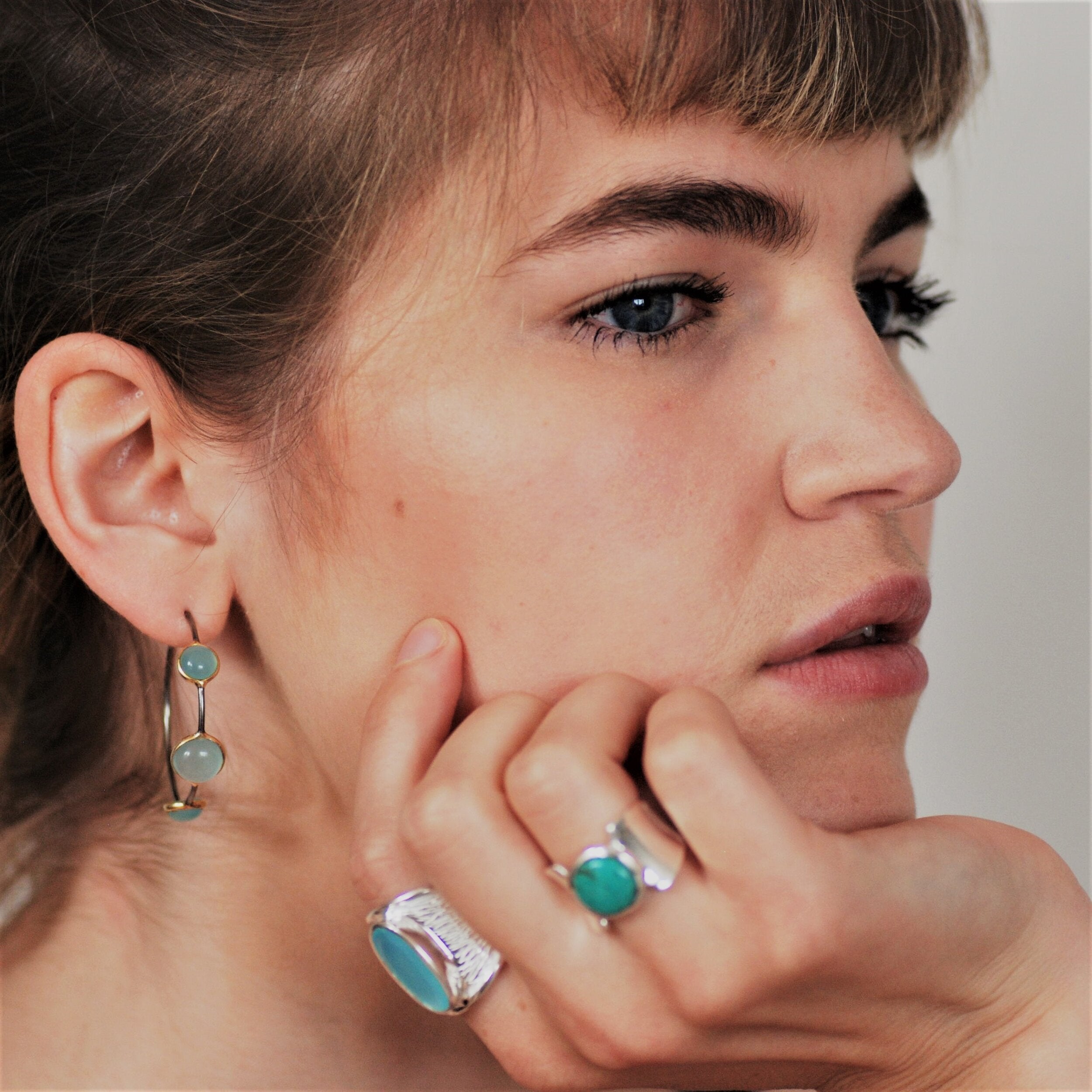 A fabulous wide band of recycled textured .925 sterling silver, with a narrow but large oval of faceted aqua chalcedony set at its centre. The stone stands slightly proud of the wide silver band, in a plain silver mount.